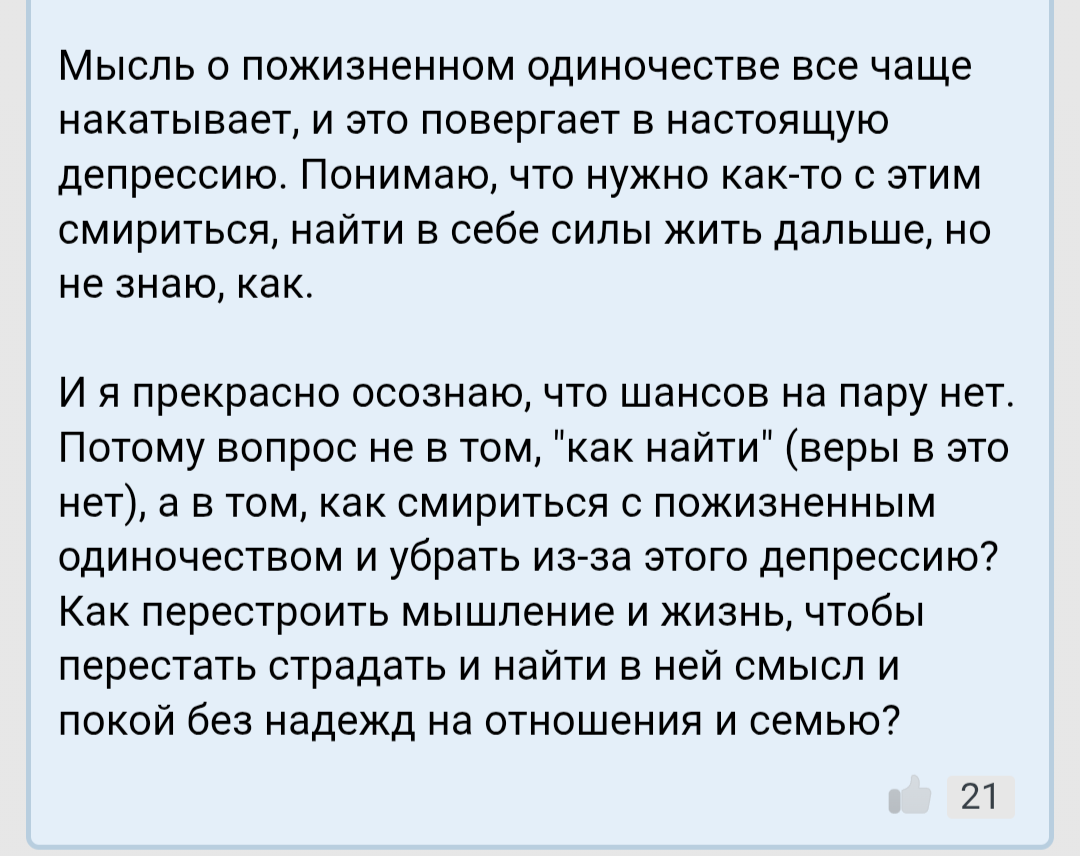 Этих денег едва хватает на еду, оплату коммуналки, лекарства и у меня остаётся 5к. Да и я ходил в бары, толку то. В моем возрасте и с моим достатком, с моим здоровьем, с ростом в 174, что мне ловить? Это как жигуль сейчас в салон с иномарками поставить. Кому-нибудь надо будет в условном ДС? На меня даже РСП 50+ с тремя детьми на позарится Я самое донное дно с глубин выгребной ямы.