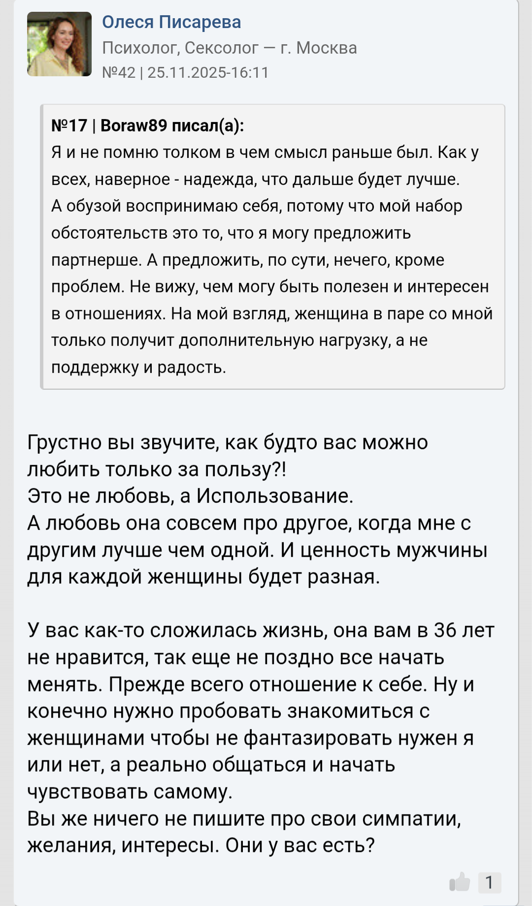 Блять это такой смех. Реально, почему я при ворохе личных проблем последнее что сделаю, это пойду у психологу? Ну может по тому что за 5к/час (а может и больше) я просто услышу: 1. У вас все впереди; 2. А вот Брюс Уиллис а вот Бенедикт Кокерстретч; 3. Да просто фокус поменяй делов то; 4. А зачем себя с другими сравнивать? Все впереди; 5. Главное харизма; 6. А вот у меня клиент лысый родился ростом 150 девок как перчатки меняет.