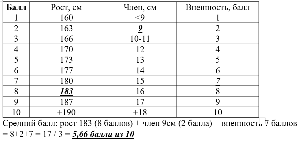 товарищи инцелы, ловите систему балльной самооценки куна, разработанную кандидатом наук просьба перекатывать в следующие инцел-треды * таблица имеет опен-код, я её состряпал за 2 минуты, поэтому нужно учитывать правило внешка>рост>хуй (как в закрепе) + при нижних значениях строк (до 3 баллов остальные параметры не важны) у кого есть желание - доведите до ума К писал, что член не важен - а вот и важен. Т.к. уже на 3 свидании надо ебаться и от тебя убегут с мелкохуем меньше 12см