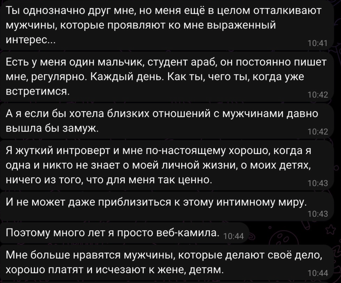 >>10449211 Да я из таких парней. Это мои мысли. Никто мне не говорил. Но это же очевидно что надо по симпатии ебаттся общаться с тян а не за деньги. Разве нет такого что это не норм? У меня есть. Тем более когда видишь что оказывается нескольким тян из миллиардов ты нравишься. Если дальше продолжать то возможно там и не несколько а вполне десятки или сотни. >>10449239 Вот мне тоже жалко. Раньше такого особо не было но когда дошло до того что все деньги на них уходят как то не по себе стало. Был на свидании не так давно. С тарелочницей. Даже ее не жалко было накормить. Ничего не вышло конечно просто поела. Но мне радостно было что вот не со шлюхой сходил пообщался. Я просто не знаю что делать. Как будто надо нормальные отношения строить. При этом ничего не получается. Руки опускаются. И думаешь я что буду всю жизнь ходить по шлюхам? А потом кто то готов тебе дать и ты все равно шлюху выбираешь. >>10449306 Ты прав. Половые игры мне не нравятся. Хочется просто любить быть любимым но когда ты любишь тян потом остывает и хуйню делает. У меня так было и это ценный опыт. Но бля. Столько денег уходит… и так всю жизнь? Пока Хуй не перестанет стоять? А как же просто обычное человеческое общение. Не знаю я сам скуф уже. Может так рассуждаю потому что гормоны потихоньку все. Но как будто перспектива всю жизнь по шлюхам ходить это хуита