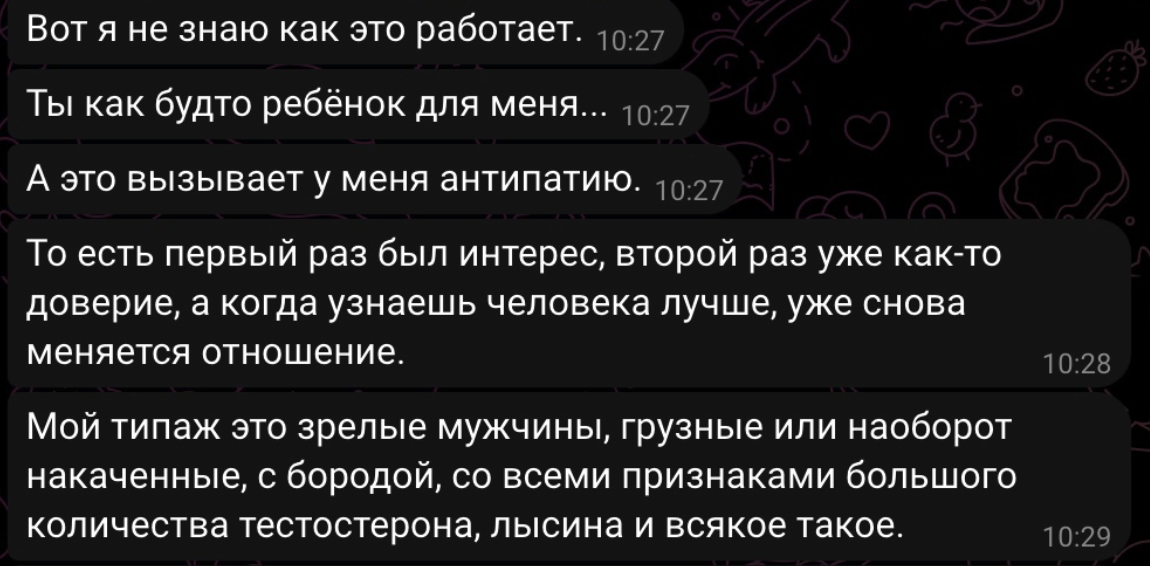 >Встречи только в формате GFE. >СУПЕР ВАЖНО: >Если вы оцениваете половой акт только как механический процесс или не любите тискаться, то ПРОШУ РАССМОТРЕТЬ ДРУГИЕ ВАРИАНТЫ АНКЕТ >Целуюсь >При взаимной симпатии Хех.