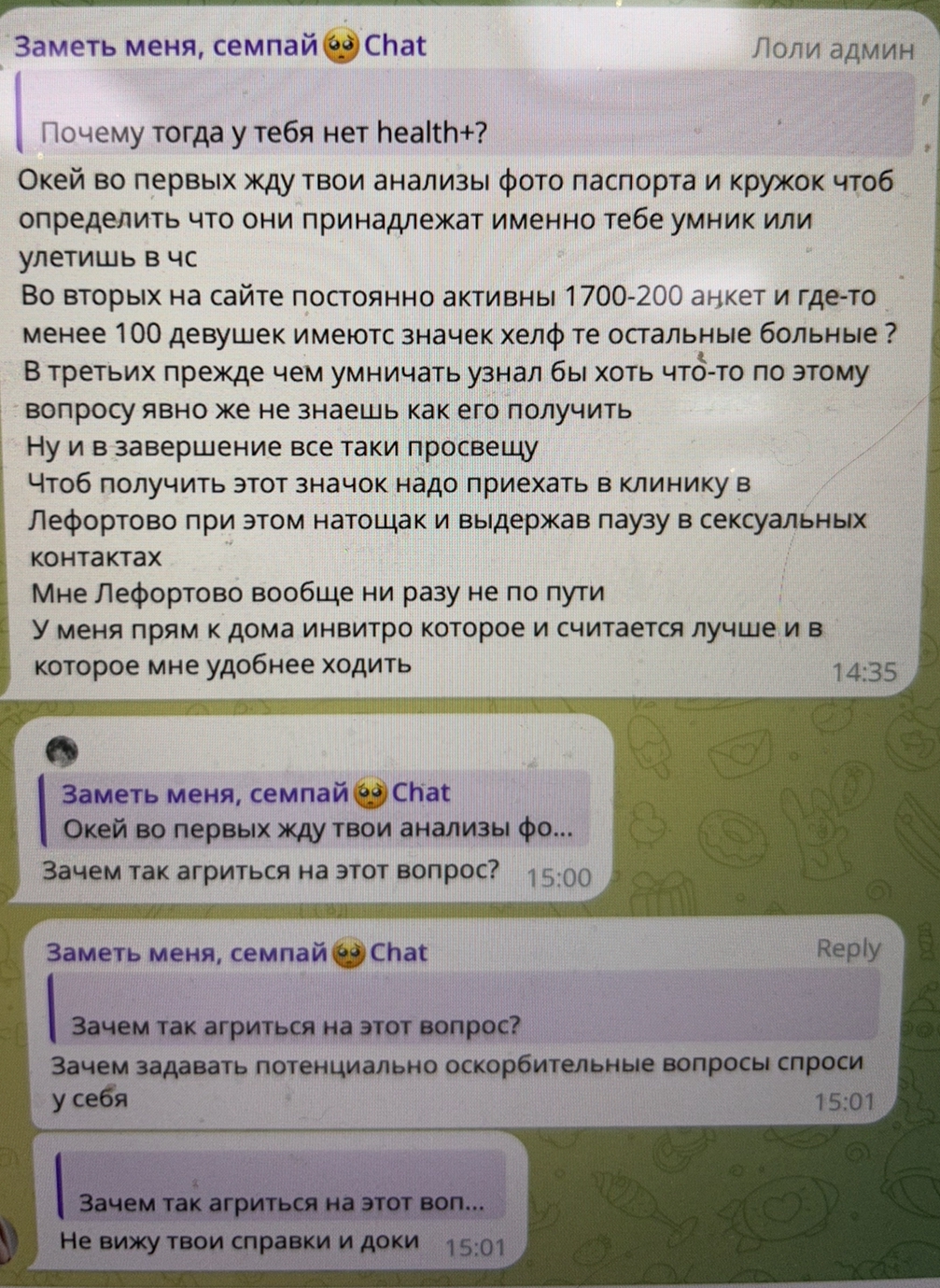 >>10446081 Прочитал, напрягся. Хотя уже два года хожу и чисто по недавним анализам. Потом написала фея, с которой я договорился на завтра и отмазалась, сказала что не может. Ну видать судьба, схожу вместо этого в дроч салон.