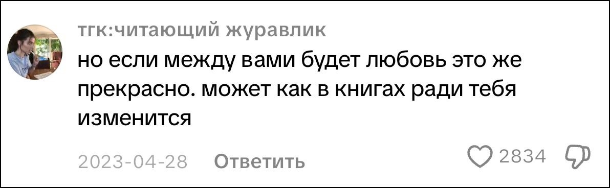 Но ты немного упустил мою мысль. Речь даже не о том, хочет ли кто-то детей или нет. Моя мысль заключается в том, что я не вижу смысла создавать прочный, долгосрочный с обязательствами, вложениями и ухаживаниями с женщиной, которая не сможет мне дать детей. Для других целей вполне подойдут другие форматы взаимоотношений.