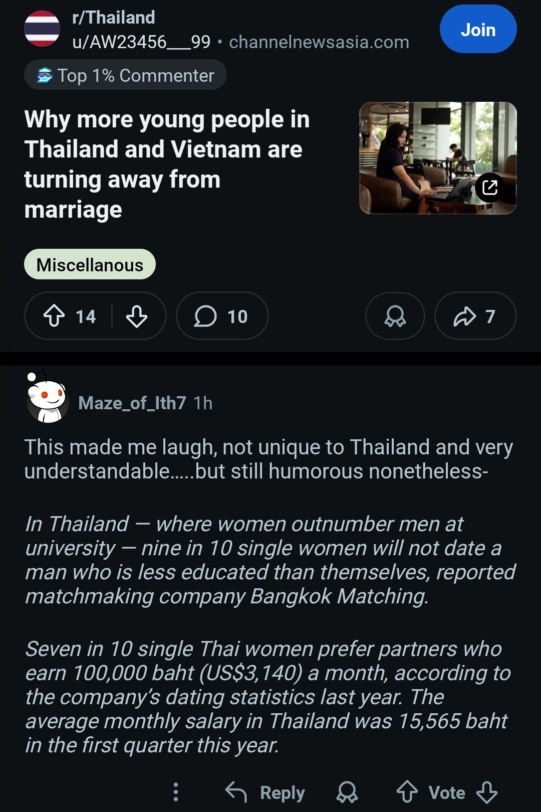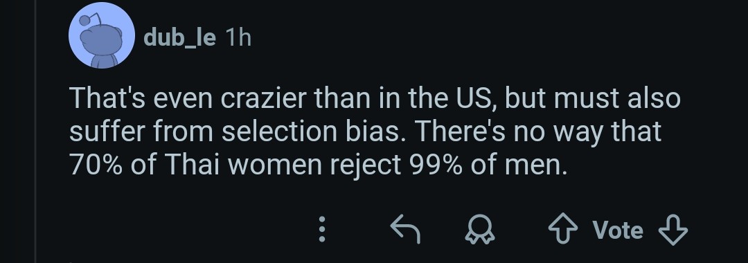 >>10461942 Там короче написано, мол 9 из 10 тайских баб с высшим образованием не будут рассматривать мужчину для отношений у которого нет высшего образования. И еще там написано, мол, 7 из 10 тайских баб не будут отношаться с мужчиной, который зарабатывает меньше 100к тайских рублей в месяц (при средней зп 15к тайских рублей). В принципе как и у нас.