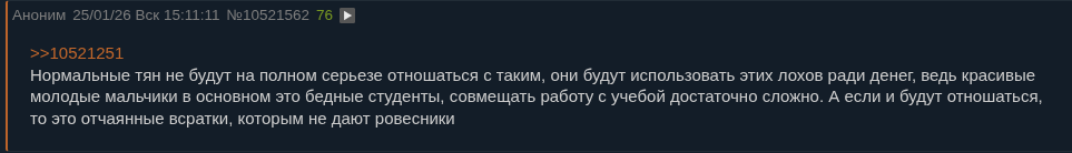 >>10502628 Да-да, кто угодно может быть охуевшим. Только у меня такого в голове не было, первые долгие отношения были максимально искренними с моей стороны, длились много лет, но закончились полным говном. Не связанным с изменами кста, но напрямую связанными с охуевшностью второй половины, которая зажралась от безделья. Иногда вижу других искренних тянок и к какой лютой хуйне их это приводит. Если тян и максимально искренняя, и свои интересы не преследует, ей в отношениях хана. У кунов вечно азарт в жопе, они охотники. Сначала они порадуются хорошей тянке, но чуть позже она наскучит и об нее начнут конкретно вытирать ноги, особенно если кун ещё молодой или считает себя таким. Многие куны признаются, что пиздюками расставаясь с хорошей тян на полном серьёзе считали, что они охуенные и таких ещё тысячи будут, и даже лучше. Старея они конечно начинают ценить такое из-за страха перед одиночеством, и то не все. Больше всего куны обожают тянок, которые заставляют их переживать, манипулируют, особенно если это в меру (в противном случае отвалятся по соображениям безопасности). Стоит стать более холодной и расчетливой, всё блядь. Будут терпеть всякую хуйню, замуж звать, все что угодно. Видела ситуации вплоть до того что одна и та же тянка долго проявляла любовь к куну, он хуево с ней себя вел в отношениях, а стоило ей переобуться и вести себя ахуевше, с неё начали и пылинки сдувать, и даже добро на измены выдали с её стороны, это как нахуй? И они долго были вместе, пока ту тян не заебало и она не развелась искать новых приключений. Не вижу ничего ужасного в том, что молодые-зелёные тян должны знать эту базу, чтобы не быть жертвами в каждых своих отношениях. Мир увы не идеален, мне тоже хотелось чтобы можно было без говна просто любить друг друга, но все не так просто, увы. Может и существует два-три куна, которые даже в эпоху красивых картинок и клипового мышления способны на искренние долгие спокойные отношения без подвоха, но большинству это приедается в момент и они сами начинают качать лодку.