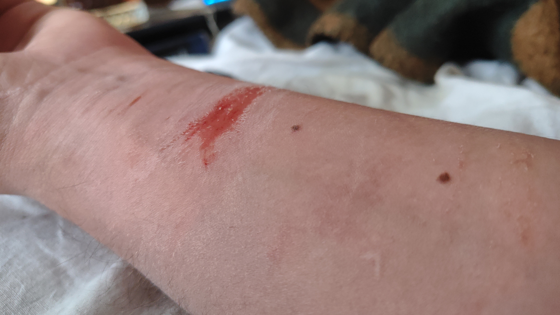 а мне наша огромная и толстая кошка поцарапала пальцы глубоко. один раз когда чесал ей за ушком то изволила повалиться на спину и пузико подставить, ну я ей пробовал чесать пузико но она лапами хвать мою руку, и немного пастью тоже, ну а т.к. она дикая то иногда не рассчитывала насколько когти нужно выпускать и в паре мест впилась мне когтями в пальцы глубоко