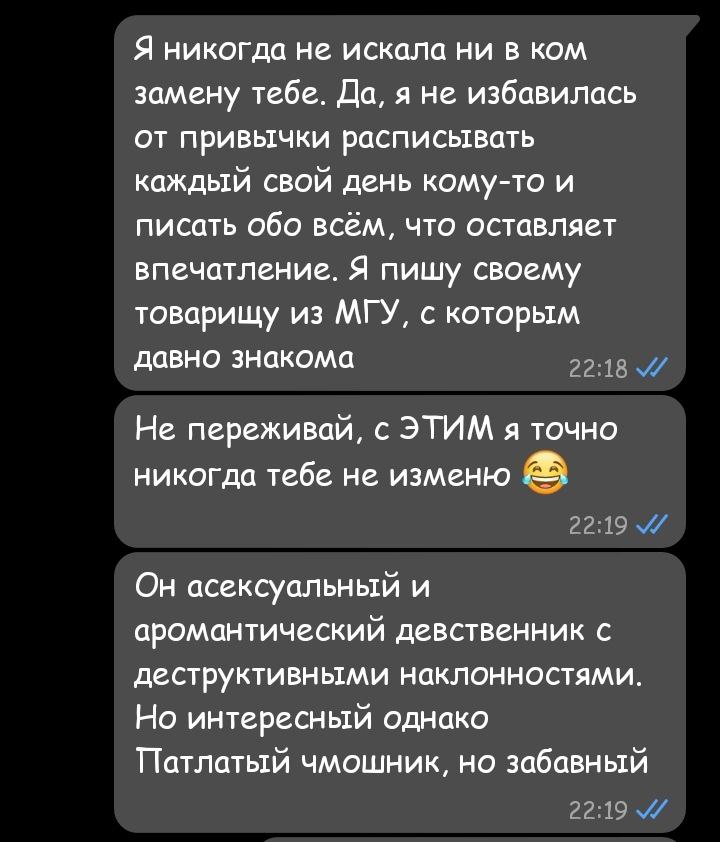 Вчера мать пару раз в бытовом разговоре повторила, что любит меня. Сделал вид, что не слышал. Поздновато чет говорит это, опоздала лет на 20 или даже 30. Жизнь заставила меня выживать без ле папа и ле мама. Неужели недавний спор про мое уродство заставило её вспомнить эти слова. Какая ирония судьбы, что у нормисной мамки до мозга костей и с фобией всего нестандартного и невписывающееся в рамки родился урод как я... прямо проклятье какое-то А че это у неё сейчас это проснулось, чому бы не продолжить игнорить меня дальше как все эти годы. Или это тетка- сестра мамки с нормальным эмоциональным интеллектом подталкивает мать?.. или отсутствие рядом старшего брата- любимца матери перевело ориентир на меня?