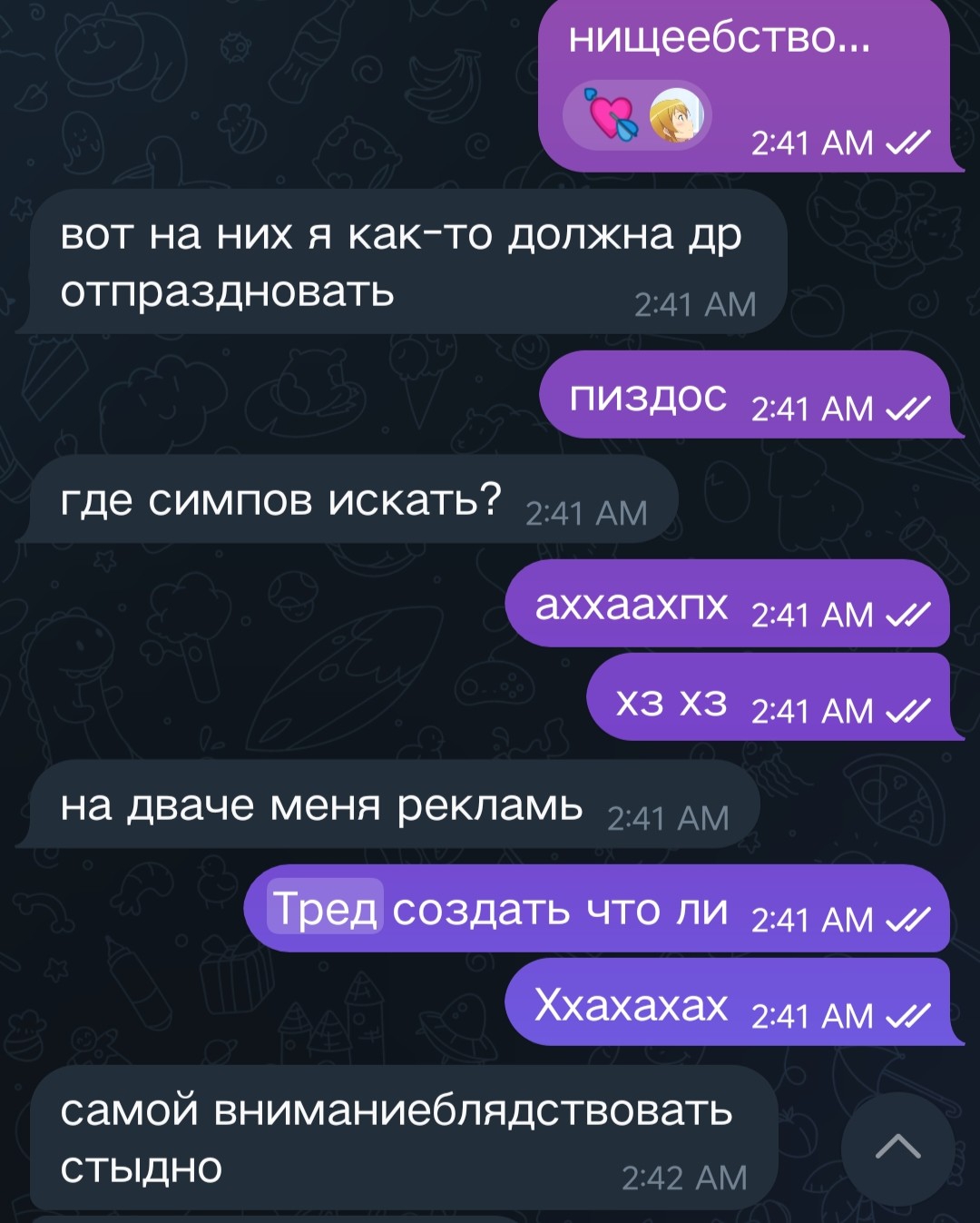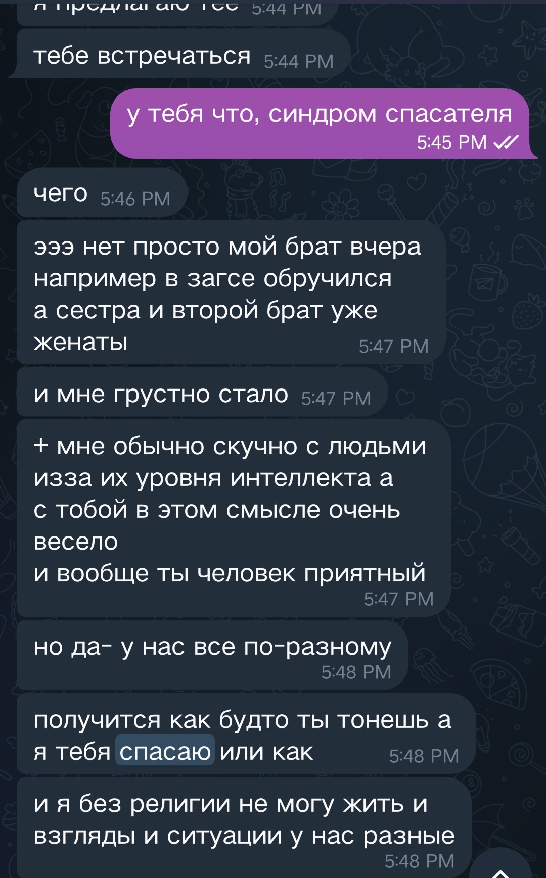 прочитал в телеграм канале Лены как она хорошо жила в 2016ом году. стало обидно и грустно потому что у меня была хуйня какая нибудь, я даже не помню. очень грустно стало что такая хуёвая жизнь. вот по этому я перестал общаться с той тян с которой отдыхал летом 24го. с этой Леной надо тоже как-то перестать общаться, но как, чтоб без кринжа. в инстаграме она меня уже опять заблокировала за то что я ей посылал рилсы, как бы так же сделать и в телеге