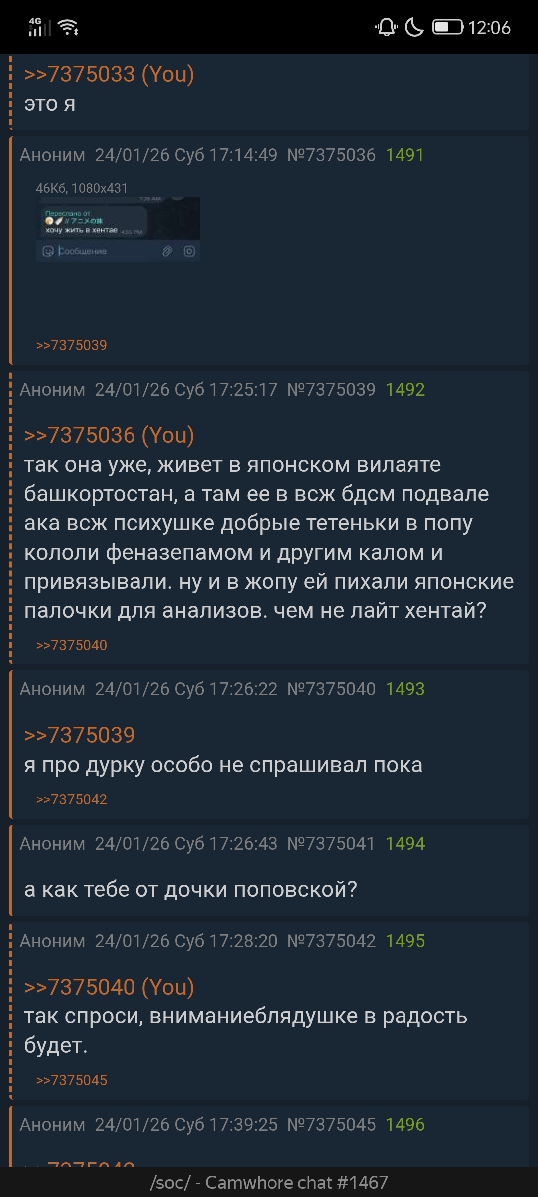 сука настроения нет уже несколько дней или это вчера было я уже даже не помню, после гадости написал скотина православная что ротсвыники бы могли обоссать и на мороз в ответ мне, после этого неприятно кряхтеть и что-либо есть, чтоб ты себе шею свернул этой зимой, мразь ебаная