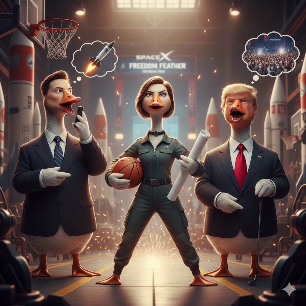 В мире, где главные гуси (Маск и Трамп) в основном заняты интеллектуальным или политическим весом, Джесси — это атлетичный гусь-спецназовец. Она доказывает, что можно строить Starship и при этом сохранять человеческий (или сверхгусиный) облик, занимаясь творчеством и спортом.