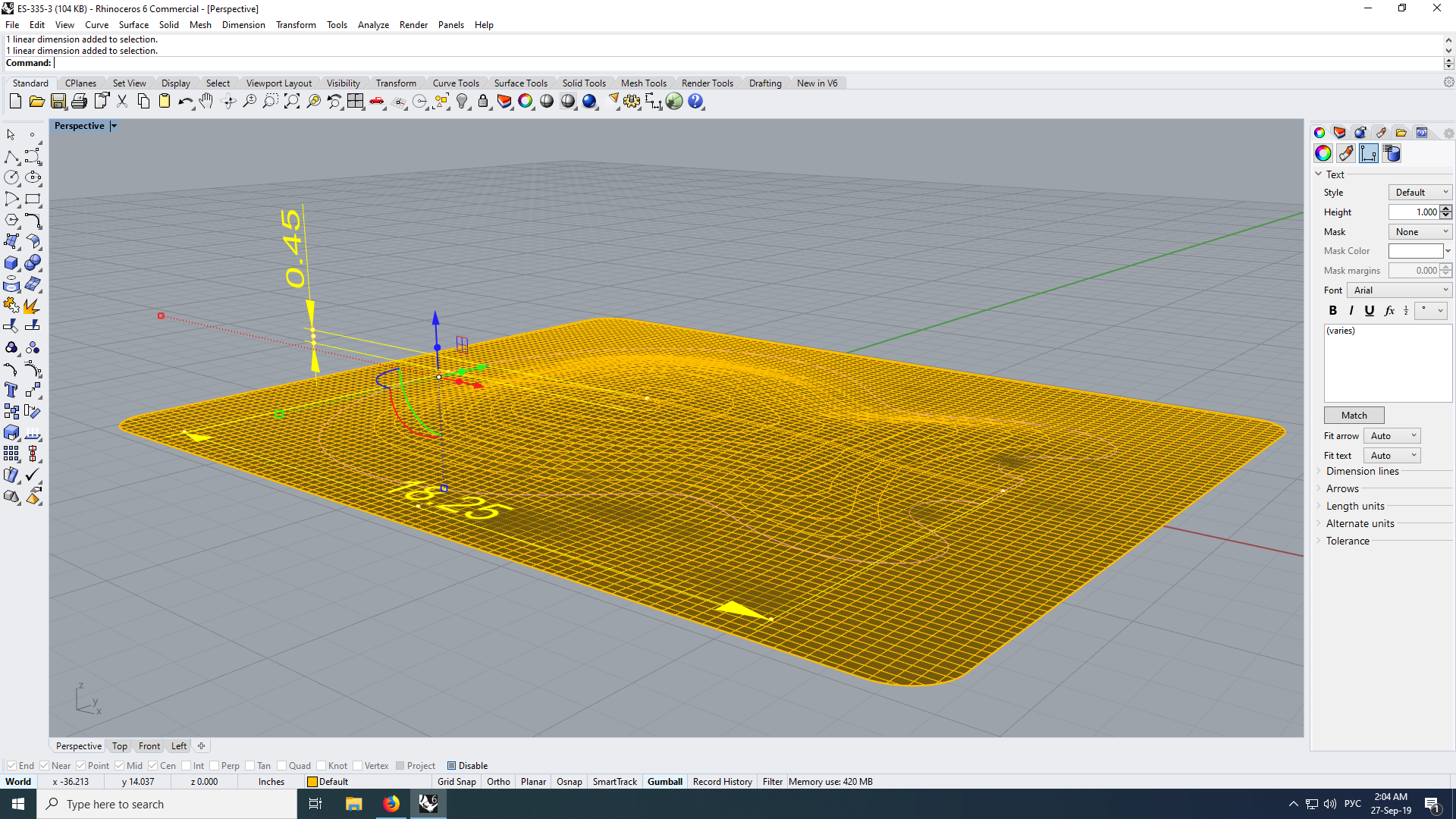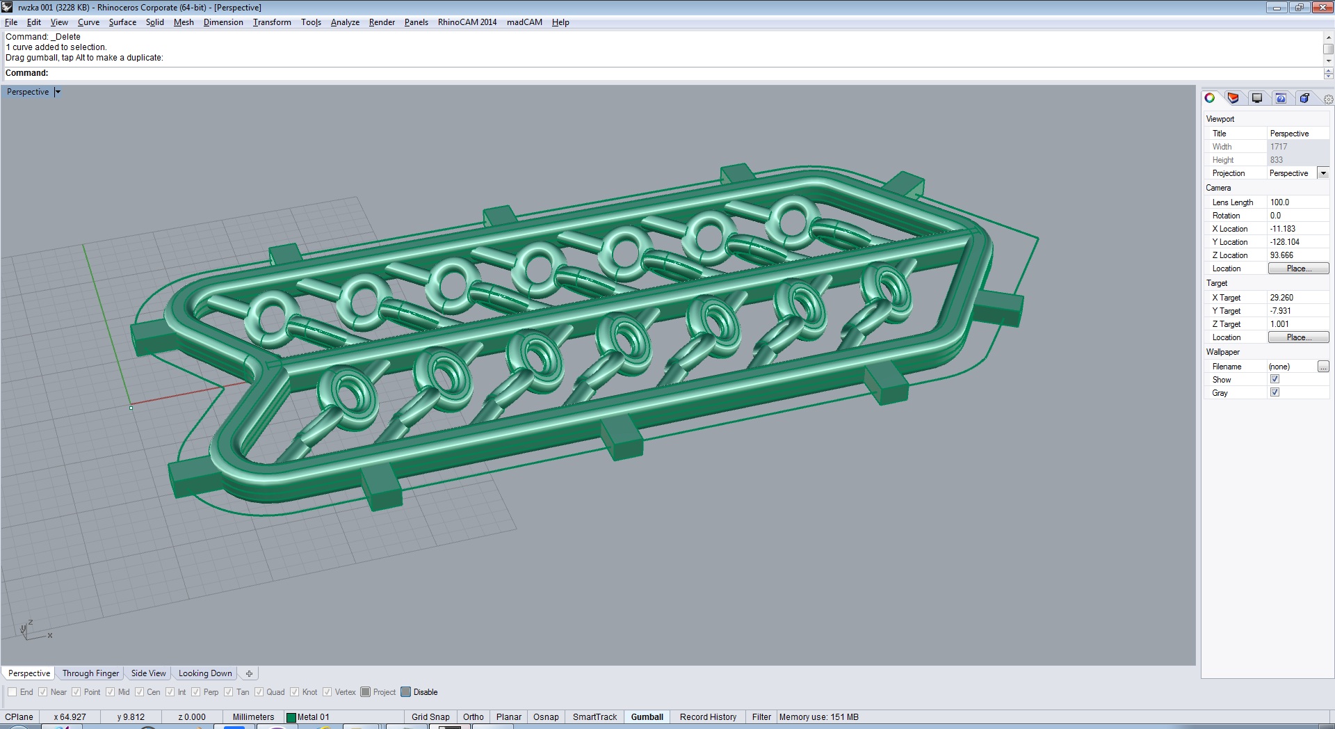 Я уже понял, что есть т.н. RhinoCam - плагин для эмуляции процесса фрезерования и подготовки программ для станка. Но проблема в том, что я элементарную вещь понять не могу: какого, блеать, размера, моя модель? Импортировал изначально чертеж в натуральную величину (а на деле - фиг его знает), в файле стоят единицы измерения - миллиметры (File>Document Properties>Units>Model Units). Поставил линейку (Dimention>Linear Dimension). См. скрин. Какого размера линия в реальных размерах? 49.14 миллиметров?! Меньше 5 см? Как точно масштабировать все эти кривые так, чтобы расстояние между двумя этими точками стало 463.55 (18 14"), как на чертеже? Ребят, выручайте!.. С меня бочки нефти.