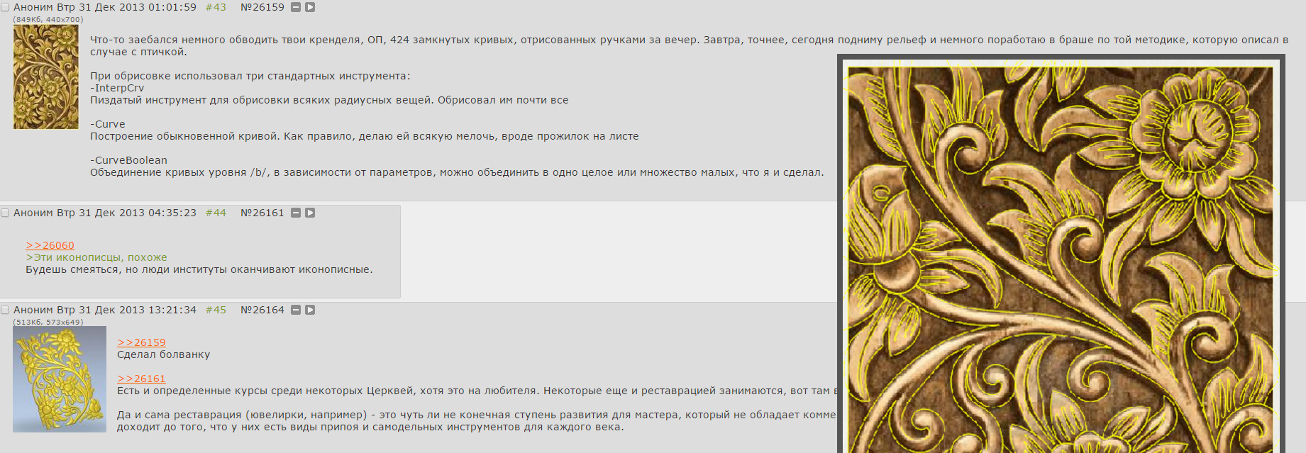 Не думал что на дваче вообще подобное обсуждение может быть, в своё время только 3д макс да блендер всё постили. Вообще бы интересно и инженеров почитать, что да как у них, CAD да CAM, вот сейчас CAM надо изучить, а инфы по нему нет практически. Ты насколько я понял в Арткаме пишешь программы? И еще вопрос, ты из какого города? Моя работа просто заключается в проектировании моделек и прочего и вообще таких людей мало насколько я понял. Пикрелейтед - то что, хотелось бы научиться делать, хотя смотрю на магазины моделек, проще купить за 2к панно, чем самому сейчас это ковырять.