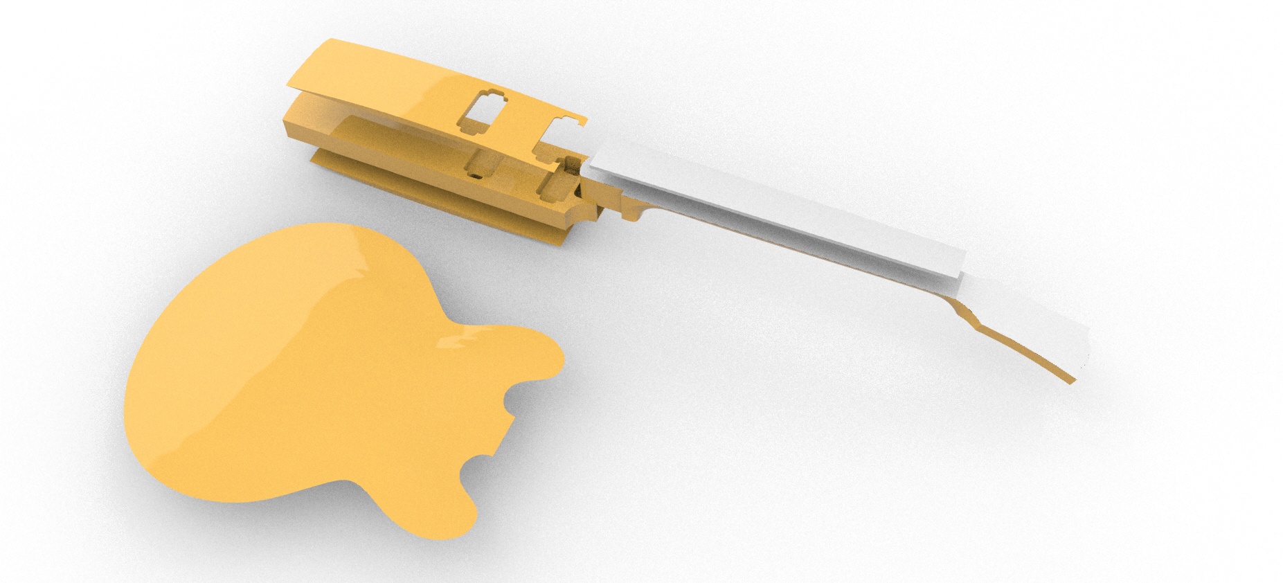 На самом деле пришёл к выводу, что для Cam можно было делать абсолютно иначе: не честно выдрачивать модель, а просто взять и сделать несколько программ, в случае грифа, например, просто смоделировать тыльную часть, отдельно поверхность волюты и тыльной части головы, а голову и пятку просто обогнать по сплайну (контур) и снять плоскостью на нижней поверхности сопряжения с карманом грифа. Остальное тут нефиг делать (поначалу помучался с топом, но это первое, что в Рино моделировал вообще).