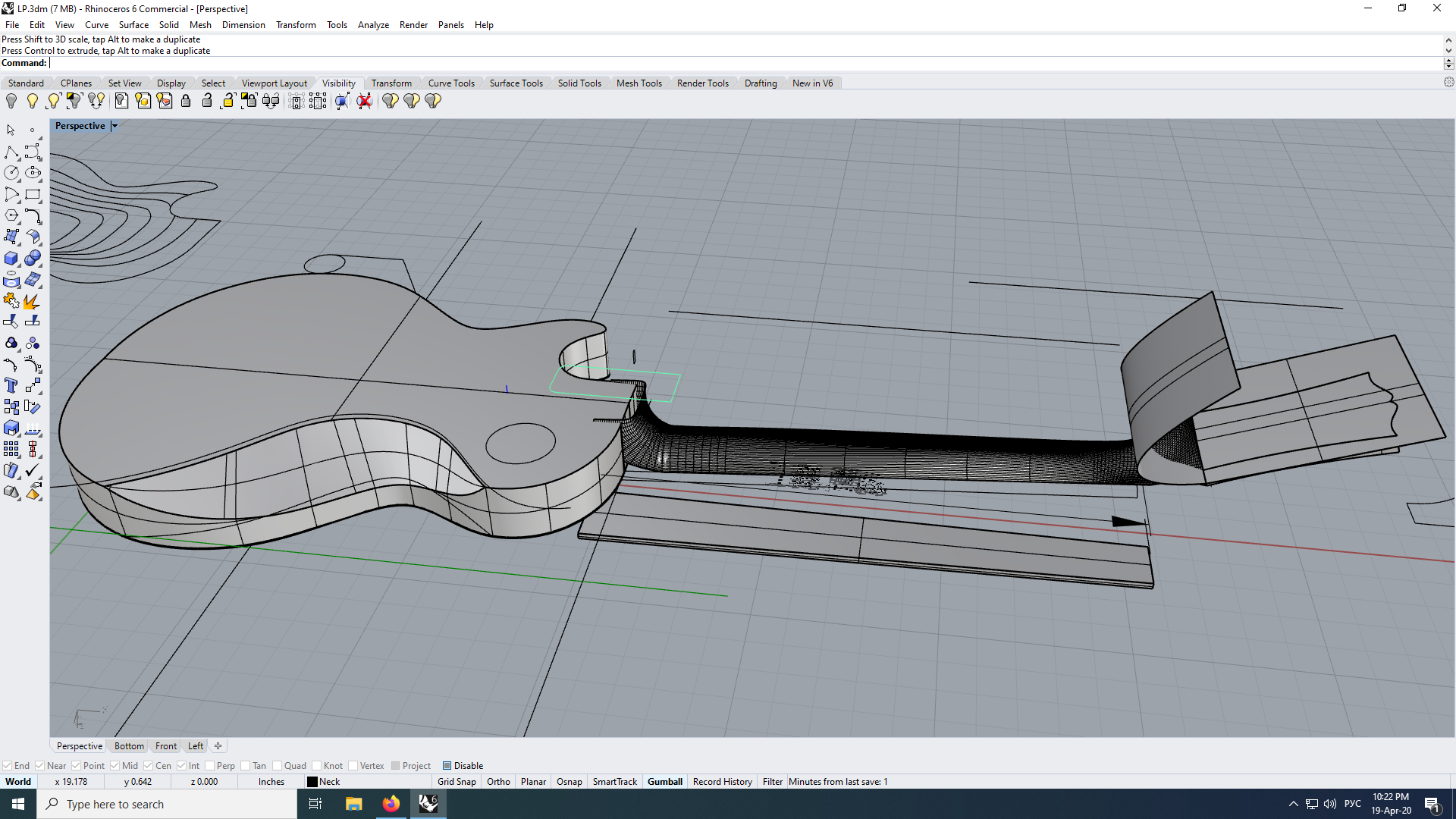 Некоторое время назад загорелся темой повторения этой легендарной гитарки, и после неудачи с "дедовским методом" (форма из фанеры, шпатлевка, шкурки и пыль-пыль-пыль, а в итоге её, эту форму повело и крутануло, ага) подумал "а отчего бы не сделать всё с применением высоких технологий? Скачал Блендер, давно хотел его попробовать, но всегда удалял после открытия, а тут новая версия подоспела. Более-менее въехал в его интерфейс, смоделировал "первый блин", результат не понравился. Думал, что дело в шейдинге, и модель нормальная сама по себе, просто коряво отображается. Экспортировал в 3DS (не хотел его ставить, много весит, да и скурвился автостол, раньше в нем моделил всякое по работе), там та же картина - просто сетку вменяемую в областях рогов сделать не удалось. Переделал. И вдруг захотелось соответствия, чтобы всё по изолиниям чертежа, точно! Вот ещё и Рино теперь... А ты говоришь про Fusion, лол!