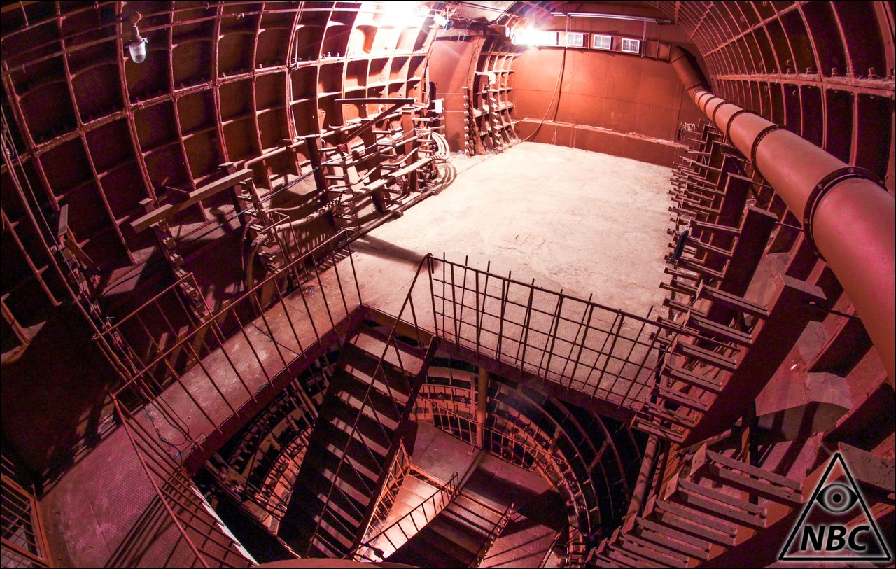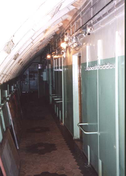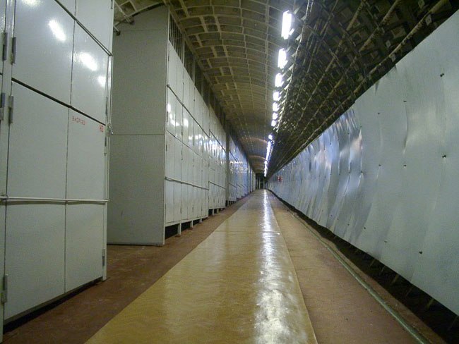 ... Сперва, как культурные - вытерли ноги. Затем осмотрелись. Ярко освещенные коридоры тянулись влево и вправо, прямо за железным трапом-переходом виднелся отрезок неотделанного тоннеля с провешенными кабелями (это переход). Решили обходить сооружение по левой руке (т.е. везде сворачивая только налево). Пол здесь выложен черной рифленой кафельной плиткой, освещение - люминесцентное. Коридор довольно узкий и спрятаться абсолютно некуда ! Справа у земли тянется серебристая труба около полутора метров в диаметре с гофрированными участками. Параллельно ей идут другие трубы и коммуникации на мощных закладных. Над ними располагается бесконечное количество запертых ящиков-секций с надписью "НЗ", но похоже пустующих. И чистота поразительная, ни пылинки, всё окрашено и блестит ! Слева в стене замечаем небольшую гермодверь, а в потолке - квадратные задраенные люки небольшого размера (кабельные «лючки»). Далее справа исчезают трубы и начинаются двери в стене, не доходящей до потолка. Одна из дверей обозначена как "Буфет". В направлении движения висят указатели "К выходам NNAB". По потолку развешена пожарная сигнализация. Коридор поделен на отрезки противопожарными гермодверями (все они открыты).
