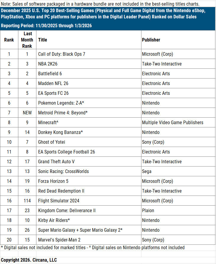 Мэт Пискателла из аналитической компании Circana (бывшая The NPD Group) представил основные показатели американского игрового рынка за 2025 год, а также за декабрь отдельно.