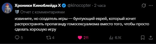Какой же эталонный обосрамс у Вавры с политшизами, пересрался вообще со всеми, леваками, праваками и даже центристами. И похуй что игра вышла хорошая, её теперь не номинируют никогда на награды, будут отказываться рекламить, и другие его проекты тоже. Чел во мгновение стал нерукопожатым во всём медиа пространстве. А мораль проста - не вовлекай политику в искусство и все будет норм. Можно даже повесточку игнорить, как экспедиция, и тоже будет норм. Просто, блять, не лезь в политику когда игродельничаешь, неужели это так трудно понять за 10+ лет со времён геймергейта.