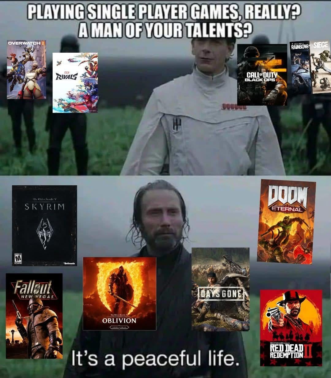 >>10061791 Ну смотри. Играя в сингл игры ты повышаешь общий скилл и проходишь невероятные истории которые в жизни не встретишь. У тебя останется память об приятном времяпровождении. Ты запомнишь позитив.