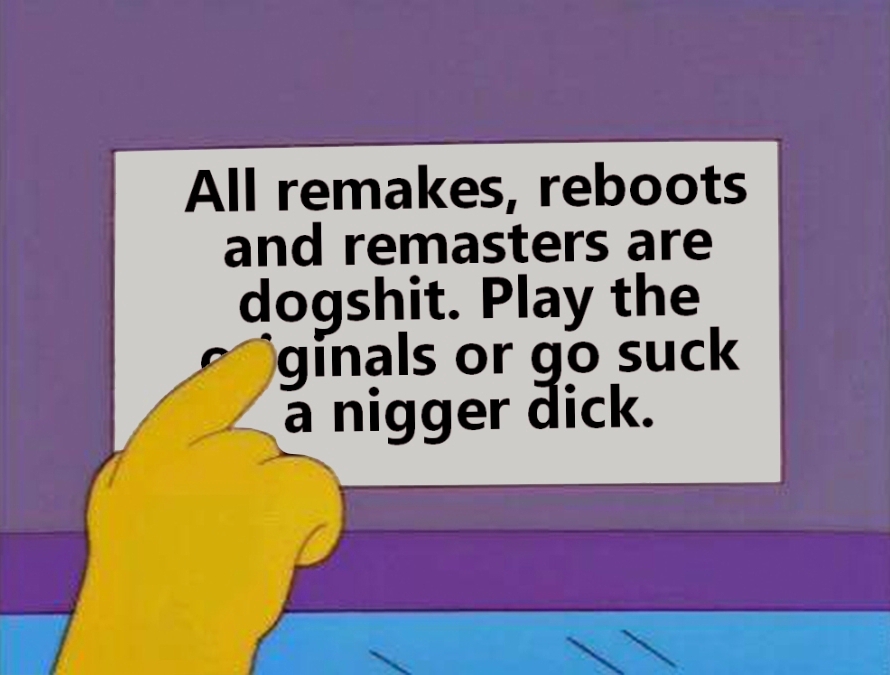 Все ремейки - это демейки. Нет ни одного примера где не проебан саундтрек, дизайн, и не навалено цензуры и прочей дрисни. Поэтому я двачую того чела, убивать всех кто просит ремейки, это пидарасы конченные и скорее всего оригинал они никогда не любили. Ремейки просят хуесосы которые отфильтровались от оригинала по какой-то причине, в основном слабый интеллект в этом решающую роль играет. Человек который любит оригинал ни за что ей не пожелает участь стать сгенерированной на урине парашей для пс5 поколения говно индустрии кАААла.