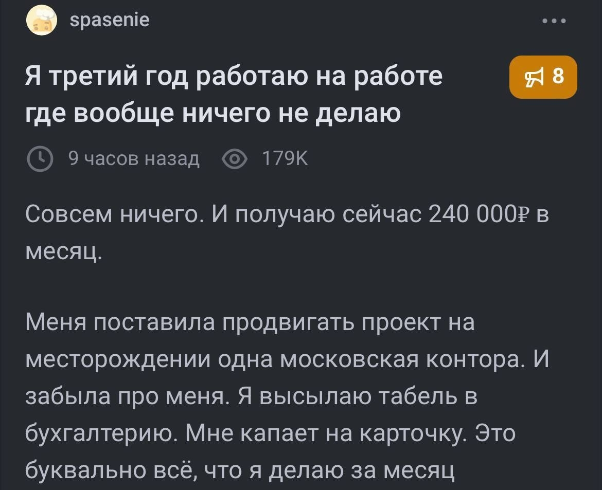 >>10053052 Ну он не пиздит, в IT есть возможность затеряться с плохим управлением. Я сейачс работаю в неделю часа 3, наверное, из того что от меня ожидают, остальное уже просто по приколу допиливаю всякие штуки. Может это конечно позволяет мне иметь вид того, что я делаю что-то, по факту же ПРОФИТ прямой компании я не приношу.