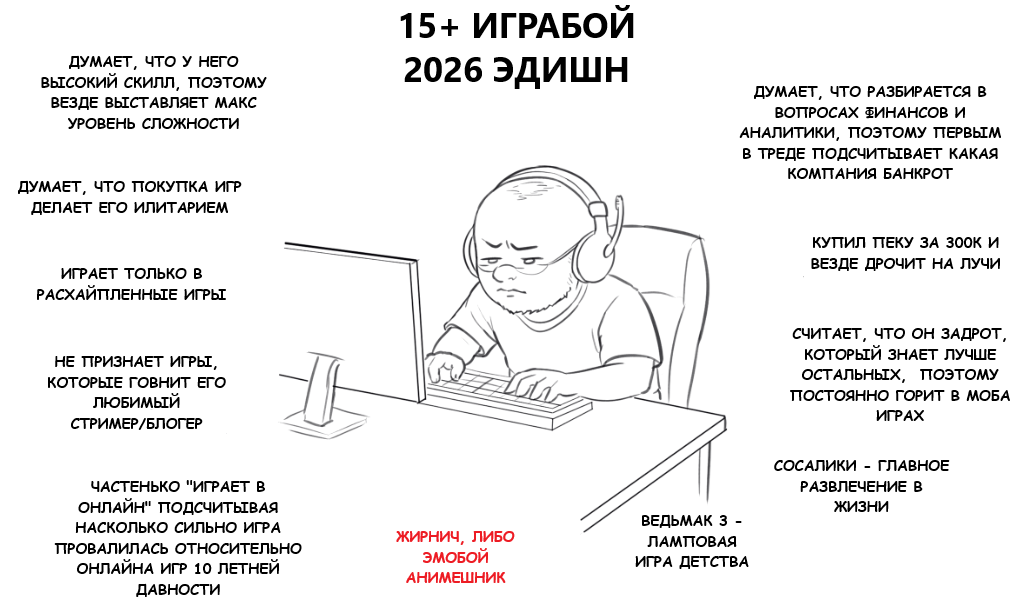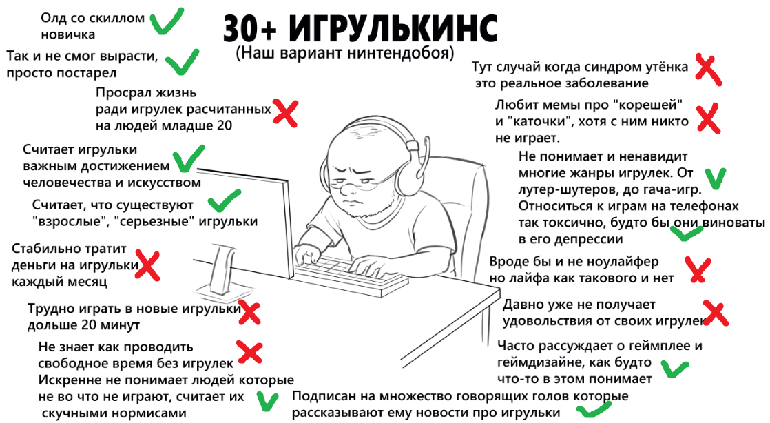 >>10077204 (OP) Хз, пикча какая-то откровенно оторванная от реальности. >стабильно тратит деньги на игрульки каждый месяц В 30+ подавляющее большинство или не тратит деньги, потому что в рот ебали покупах, или тратит очень редко, потому что поди пройди накопленный бэклог. >подписан на множество говорящих голов Чисто зумерский прикол, большинство 30+ игрокритику, билдострой и прочее на юпупе не смотрят, они всем этим в свое время начитались уже в игрожуре, лол. >просрал жизнь ради игрулек А это уже пиздецки древний момент, который в наши дни поди найди. Большинство великовозрастных игроков стопроцентные нормисы с женами-детьми-дачей-отпуском-ипотекой. Когда-то игрульки и маняме были уделом нитакусек, в наши дни это нормисное развлечение. >не знает как проводить время без игрулек Ну это как предыдущий пункт, очень старый прикол, устаревший уже в нулевых.