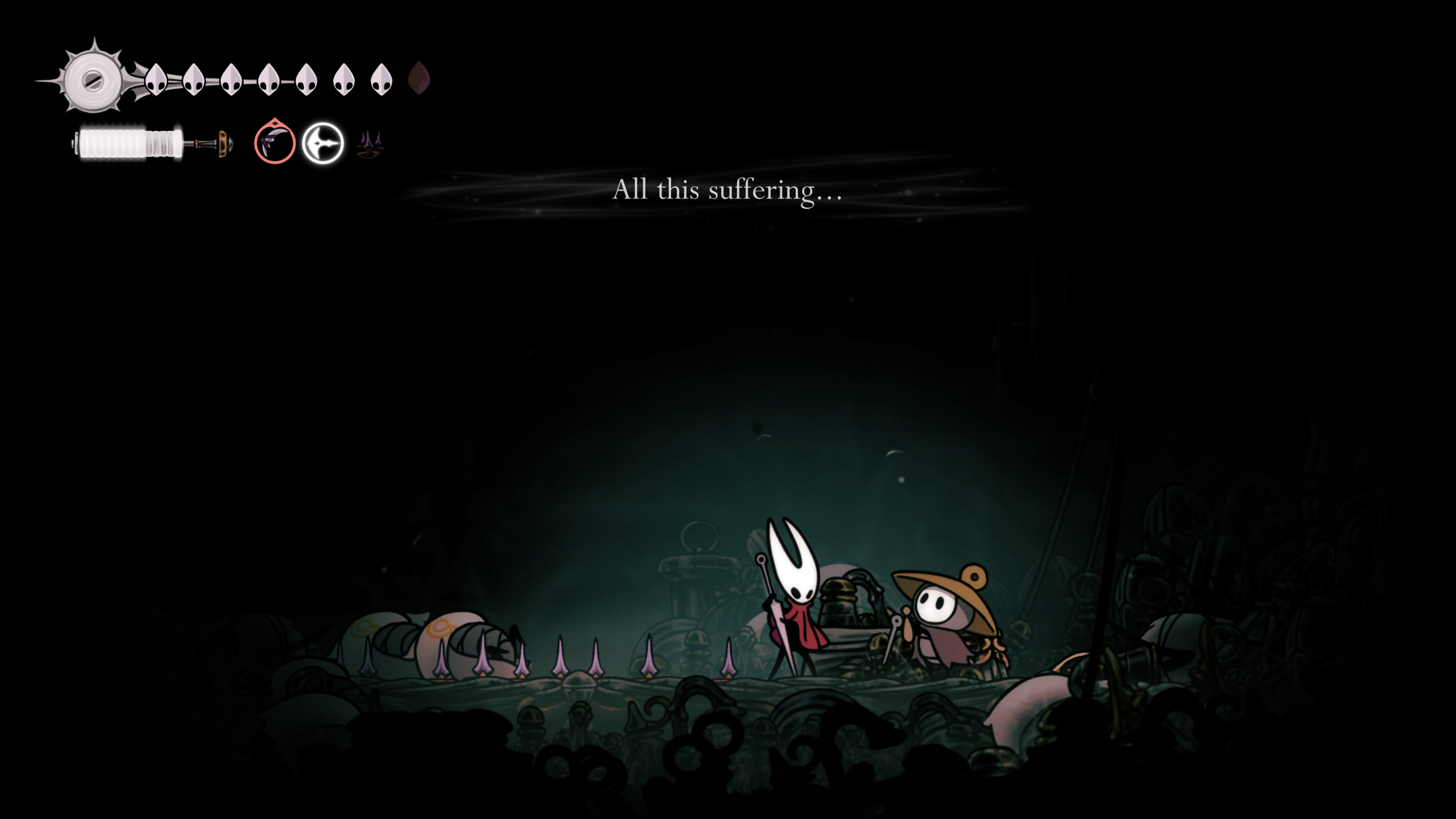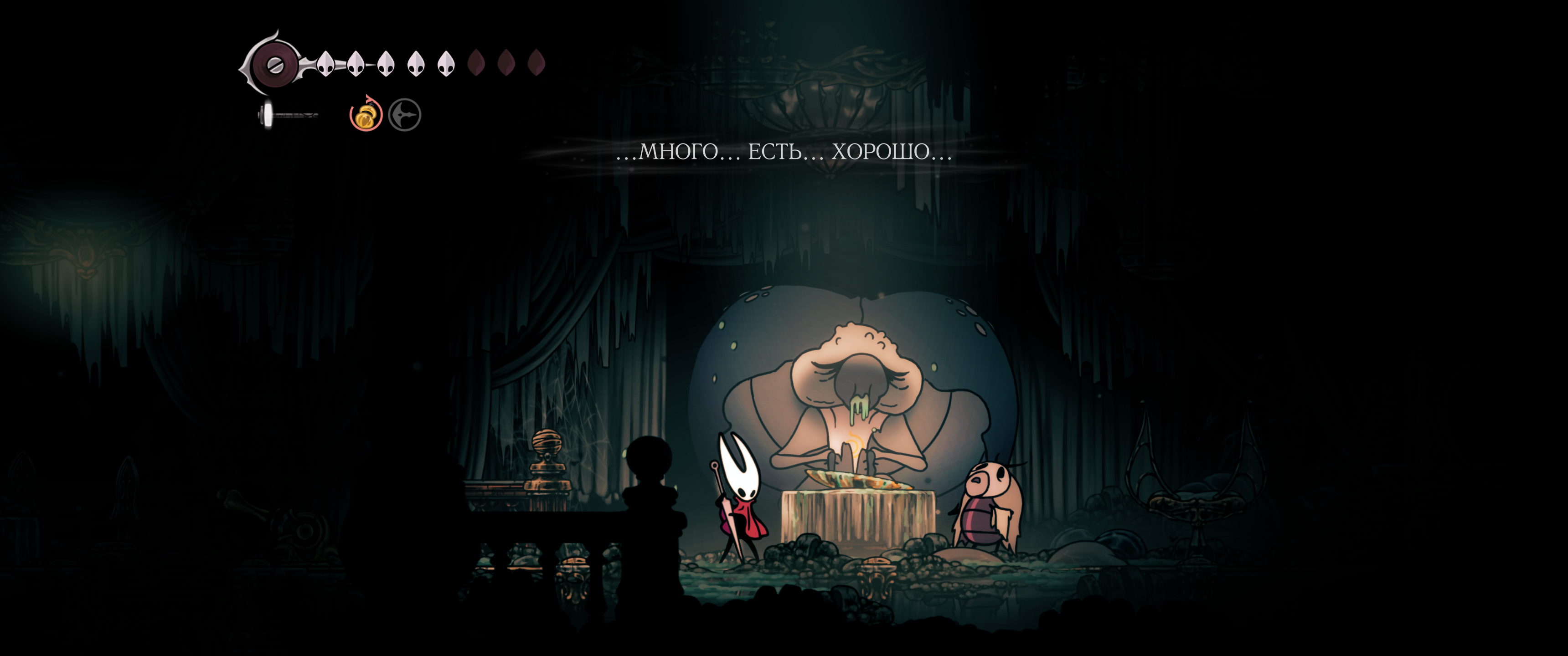 Кроме шуток, у Хорнет большущие проблемы с эмоциональным и социальным интеллектом. Я списывал это на то, что у неё по сути не было нормальной семьи, но скорее всего это у неё от природы, всё-таки какой-то мутный союз ткача и червя, может что-то поломалось. Скорее всего она в принципе не обладает эмпатией и ничего не чувствует во всех этих моментах в игре, где вы бы проронили слезу.