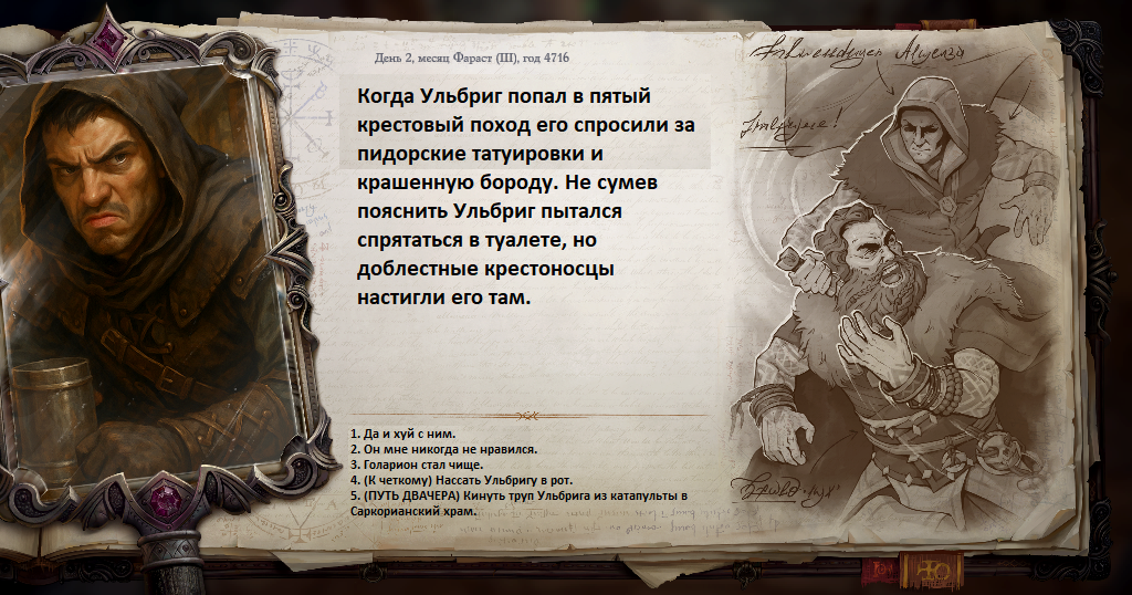 Максимально разобрался в квесте с поиском импостеров: из четырёх достаточно найти двух, прачку отпустить, а в группе из трёх дворян пройти проверку на убеждение и дать служанке заклеймить дворянина из торгашей и даровать милость старому священнику.