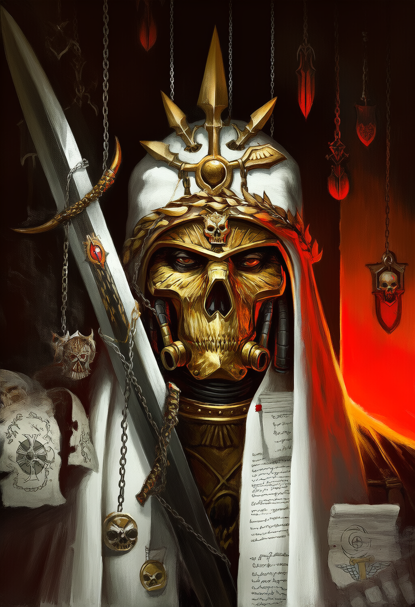 "A grimdark gothic portrait of a Ministorum priest from Warhammer 40k, wearing ornate white and gold ecclesiarchal robes, purity seals, parchment scrolls, golden aquila, gothic relics hanging from chains, burning incense, stern and fanatical expression, cinematic chiaroscuro lighting, painterly oil painting style, official Rogue Trader CRPG character art style."