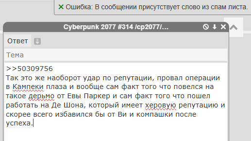 >>50309109 >Альт создатель Душегуба. Душегуб имеет такое же отношение к биочипу как программа сканированя изображений к устройству и работе видеокарты. >подробный план Ну ты там это, найди и подключись к Микоши. >Здесь тебе звонит непонятно кто с замазанной камерой и говорит что может тебя вылечить. Кто-то еще звонил на биочип? >Профессиональный наёмник, тем более бывший контршпион изучит все аспекты задания и оценит возможные риски вместо того чтобы как тупой болванчик идти и делать то что приказывают Главный аспект: задание выдает лично президент НСША которая распоряжается всеми ресурсами государства. В случае успеха - ресурсы пойдут на благо Ви. Больше его ничего в этой ситуации не ебет. Тем более что за операцию отвечает в первую очередь Рид. А Ви просто его помощник. >Пчел, вот ради интереса почисти эти мелкие квестики "sc" особенно в Пустошах с участием Милитеха. От обычных бандосов они отличаются наличием формы Чистил. Кого ебет кто чем отличается? На данный момент так мир устроен. Когда-то и рабство было само собой разумеющимся. До середины 20-го века люди с удовольствием массово резали друг друга. В том числе из лучших побуждений и буквально во имя Господа-Бога, лол. Сейчас рулят корпы. И каждый нормис мечтает в них работать. Как самый обычный добрячок, так и распоследний психопат. Потому что это статус и гарант сытной жизни. >Вот только Риду радости от этого немного Как я и сказал - типичный муви-троп. >И "повысили" судя по всему до старшего помощника разносчика кофе Это маняфантазии. Чела из болота перевели работать в штаб-квартиру конторы.