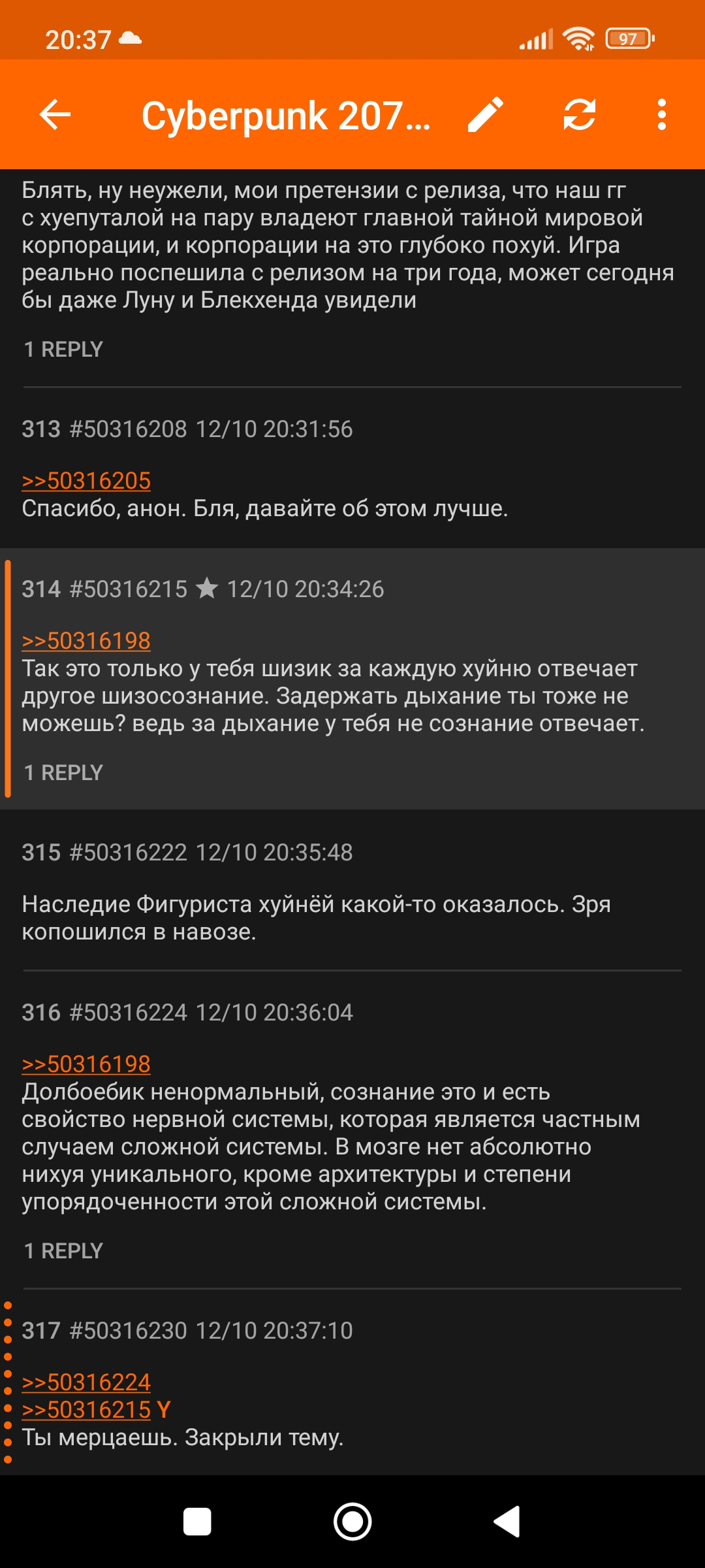 >>50306838 >Конечно! Прямо сейчас! Всё что хочешь для тебя сделает! Даже тебя владыкой мира Че на визг сорвался? Чмойка влезла в биочип и сказала что знает о ситуации Ви. И знает как помочь. В безвыходной ситуации чем не вариант? >Нет. Лол Твой манямир. >Кокой послушный раб 1) Я жить хочу в первую очередь. Об остальном можно размусоливать когда с этим пунктом прояснится. 2) Майерс поручила работу, которую Ви уже 100 раз выполнял для фиксеров. Даже блять не убить цель - просто вернуть. Ви выполняет работу как порядочный наемник. >Жалко корпов которые считают людей и тебя в том числе за куски мяса? В душе не ебу что они там считают или нет. Может они за еду для своих детей работают. Я зафиксировал простой факт наплевательства на чужую жизнь. >О да! Власть ради власти То-то Жудичка визжит как в НСША охуенно и какая же ебучая помойка этот Найт-Сити. >куда его девать? На улицу выкинуть? А что мешает? >Вроде как Рид не поймёт Лол. >К тому же Рида после всего этого вообще понизили со спецагента до планктона С какого перепугу перевод в штаб с чумазого полевика это понижение, лол? Этому штампу лет больше чем тебе раза в 3. Типа был крутой полевик, его повысили и больше не нужно работать в поле, а ему не нравится такая работа и хочется быть простым челиком мотаться по миру на опасных заданиях.