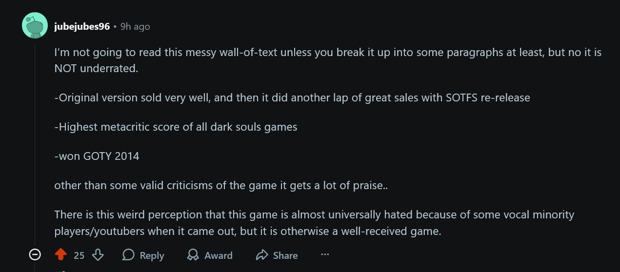 >>50293661 Помоему елда(особенно длс) это вершина хуетаковского гения. Боссы сложные, локации душные всё как надо. Что не хватает? Если только нормального пвп из двухи, но это имхо.