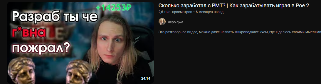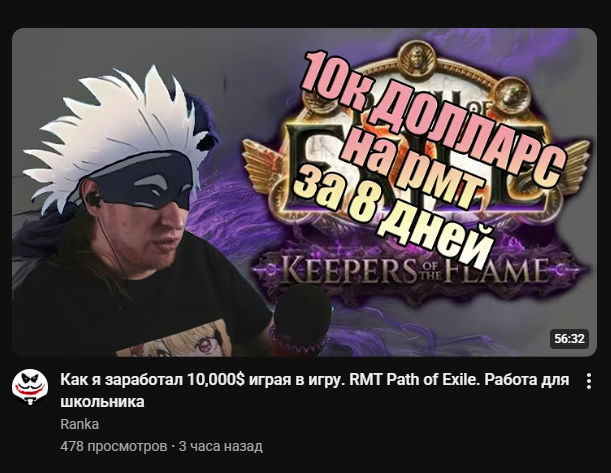 так я в пою и бесплатно буду играть это не считается как работа это всяким залетухам рмт в пое это пытка а м не покайфу гриндить мобчиков и выводить главное не усираться до предела типа акты за 4 часа и потом месяц в подвале сидеть а то реально кукуха уедет