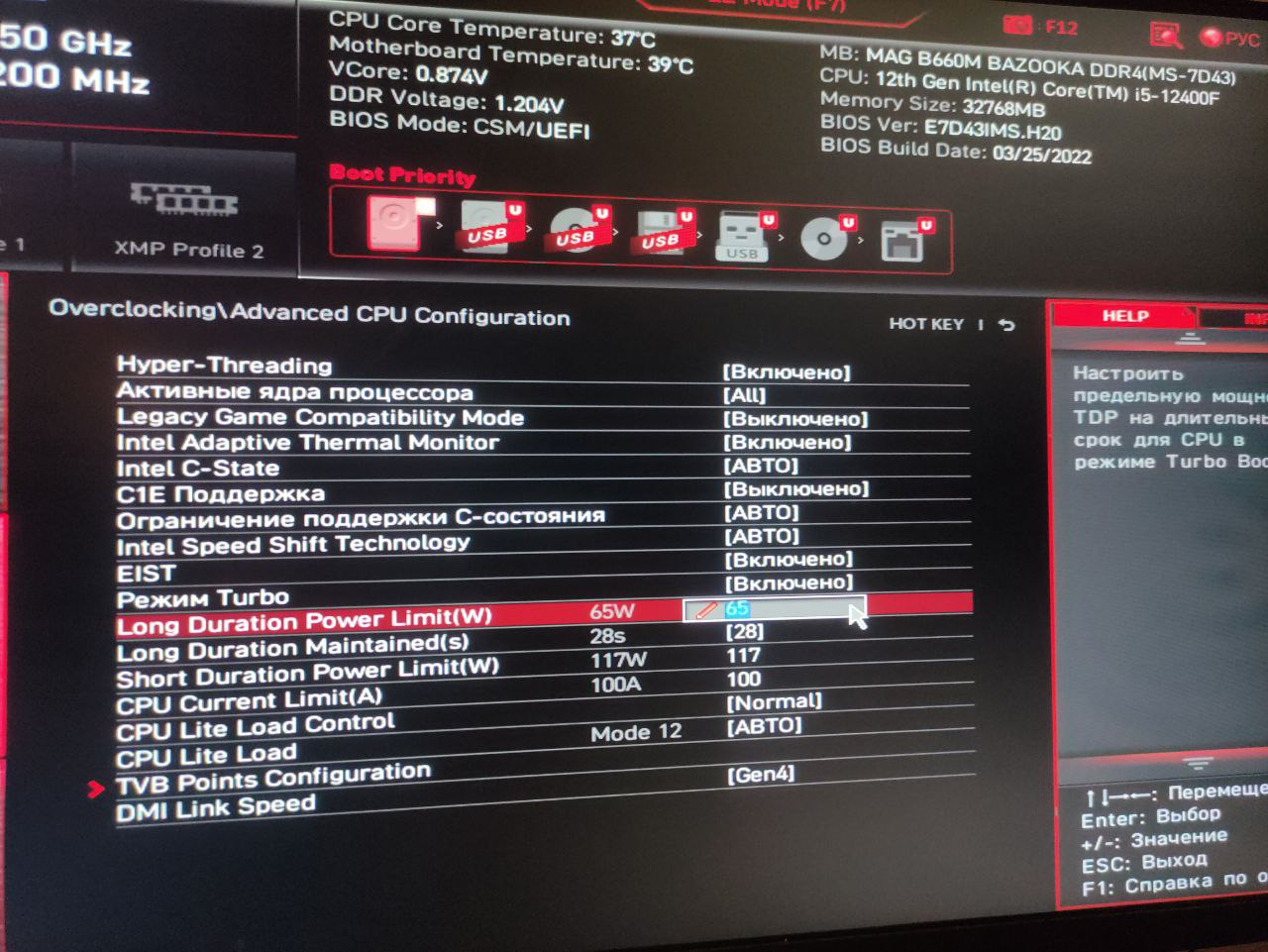 >>50401497 Короч, разобрался я (вроде бы. Но хоть обучение прошёл, теперь при запуске игры в меню буду попадать). У меня в биосе стоял вот такой лимит. Я выставлял на стандартный в 65 ватт, но всё равно не помогало. А вот выставить стандартный, потом F10 и перезайти, а потом ещё и вручную прописать эти лимиты в 65/117 ватт, 28 секунд, и, самое главное. Там стоял лимит 151А, я выставил 100А. Проц вроде от этого теряет производительности на несколько процентов, но с другой стороны и греется меньше. Как же я счастлив Вот на второй пикче видите, лимиты как бы стоят (скрин старый, у меня стояли 65/117), но как бы АВТО. Мне помогло продублировать значения вручную, сделал как на третьем скрине, и всё заработало