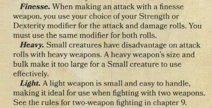 >>50311631 >у легкого оружия (кинжалы и т.д.) от ловкости Нет, свойство "легкое" позволяет сражаться такими оружиями в двух руках. Просто многие легкие оружия еще и фехтовальные, но не всегда. Дубинка, серп, топорик - легкие, но не фехтовальные. Рапира, хлыст - фехтовальные, но не легкие.