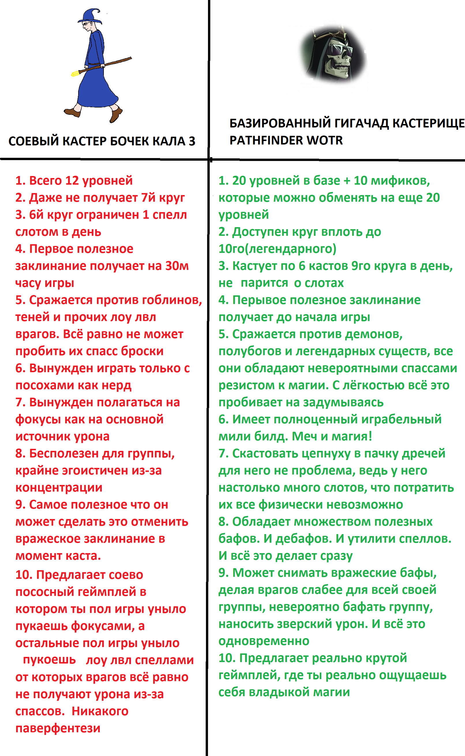 >>50412477 Дефайн маг. Колдун - это не маг. Это стрелок с утилити. И волшебник - это не маг, если ты про урон. Волшебник собирает себе 20 КС и ставит раком всю игру. Контроль настолько нечестный, что я думаю вообще от него отказаться. Чародея нужно правильно менеджить и это большой гемор. Взять самую тяжелую дубину на варвара гораздо проще. Но там, где условный файтер потратит все свои 10 атак, которые еще и попасть должны с гвмом, сорка просто разок рыгнет сдвоенной молнией.