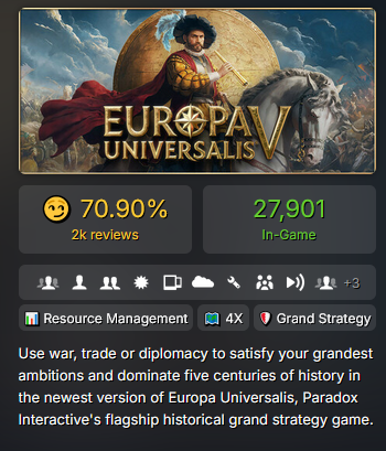 Какая-же крутая ваша ЕУ5. Экономика как в виктории, политика как в крузаках. Интерфейс приятен глаз. Война как крузаки, только теперь удобно отслеживать демедж сверху сражения. Красота какая.