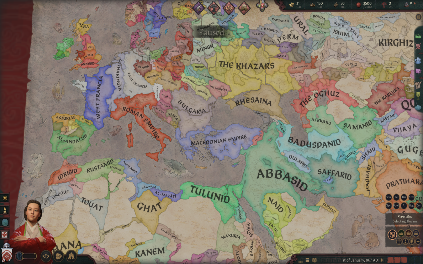 1 - Сделал Риму два королевства на Альпах для зашиты фронтира, через консоль взял решение на восстановление Империи и, опять таки консолью, переставил де-юре границы. Так же вместо ванильного Каролинга сделал кастомного правителя с римской культурой. Оставил их Католиками.