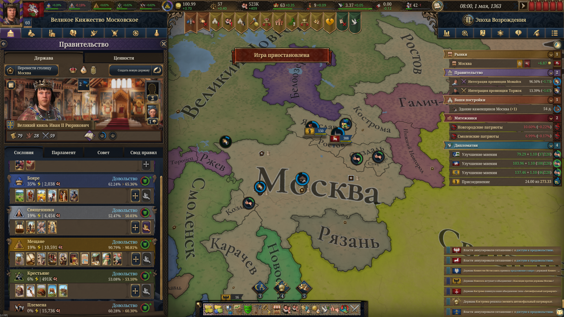 При этом не я один страдаю от этой срани, у ИИ тоже есть провинции в вечном бунте из-за модификатора какого-то эвента. И вешается он только на крестьян почему-то.