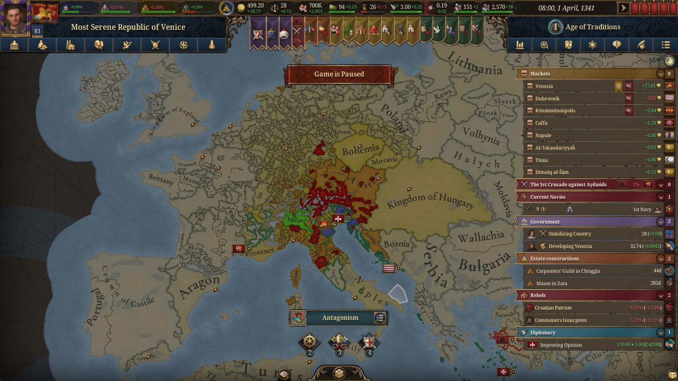 Ебать за Венецию весело. Болезни и наводнения ебут конечно, но войны прикольные. Во время войны против Вероны пока моя коалиция ебала Верону, их армия в 15к тупо стояла у меня в провке рядом с венецией ине двигалась. В итоге войну они проебали, но я ничего не смог отгрызть. Щас сам влетел в Феррару, а за них впряглась Аквилея, армию аквилеи я тупо утопил вместе с флотом, а 1к феррары оказались запертыми на каком-то копроострове в Хорватии. Щас обоих аннексирую и посмотрю какая коала соберётся.
