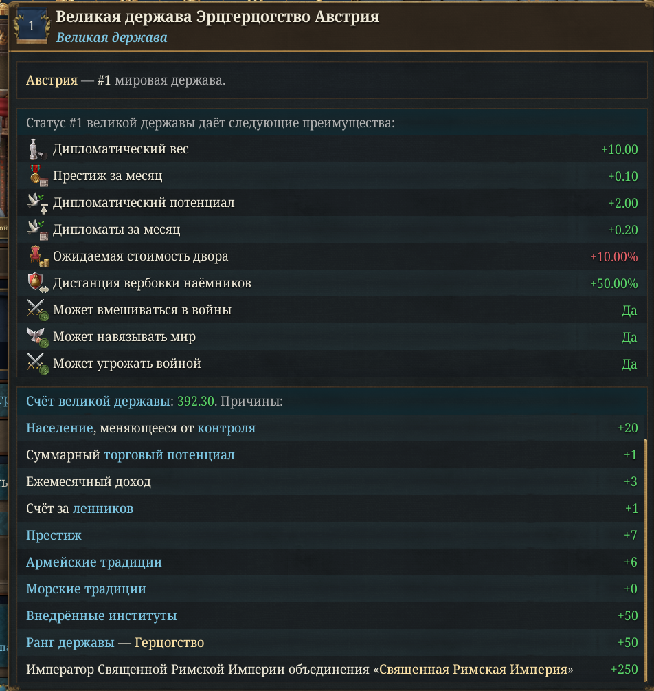 Сел за Австрию погонять через ДИПЛОМАТИЮ и спокойно построить домики и ничего не понял за первые 10 лет. Заключил пару союзов с электорами (не мои райвалы), кинул союз своему единственному униату на старте игры - они все буквально через пару месяцев разорвали его. Войну никому не объявлял, диплолимиты не превышал - что за хуйня? Тут можно вообще кого-то мирно завассалить будучи СИЛЬНЕЕ и настакав ДИПЛОРЕПЫ?