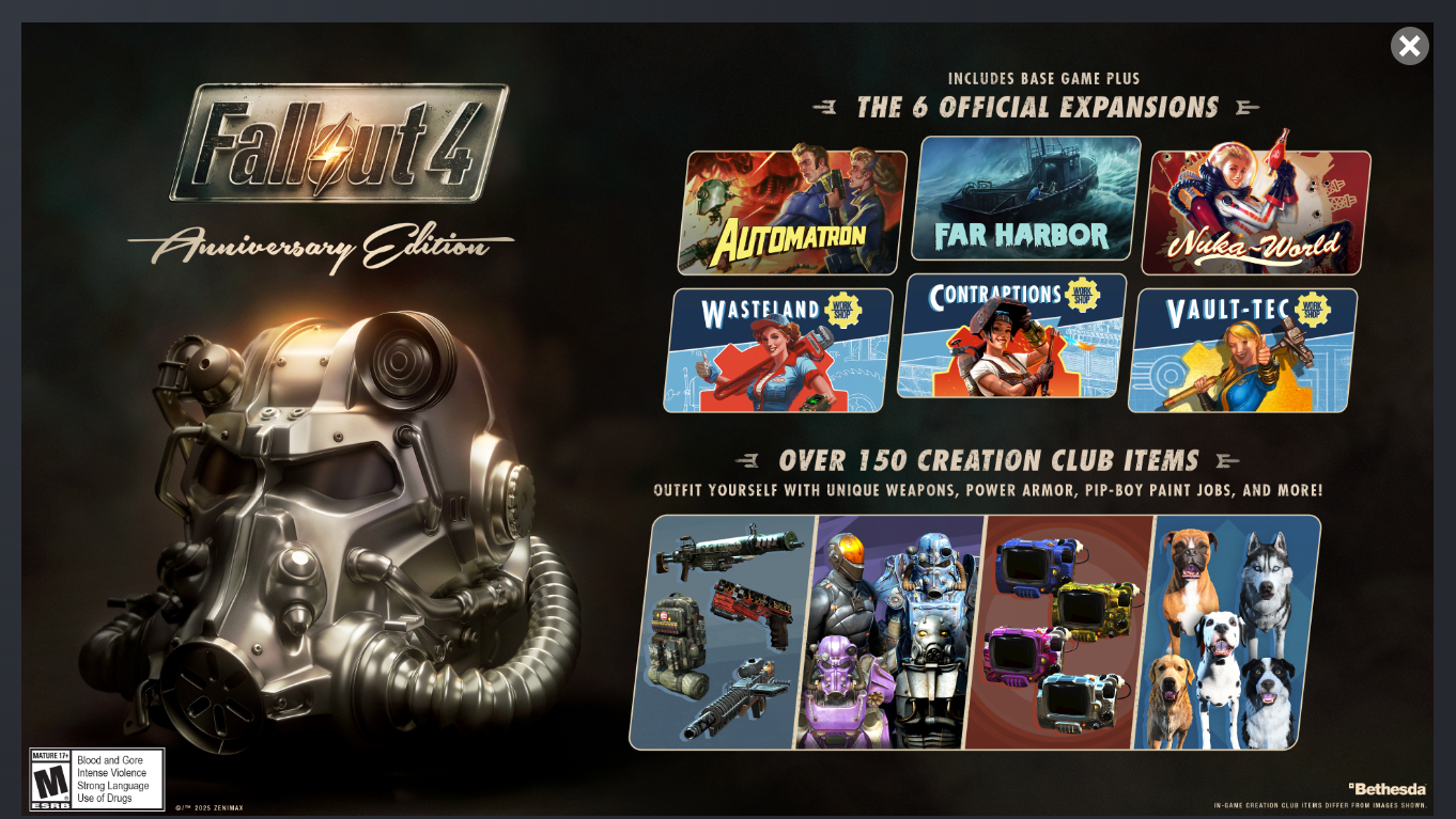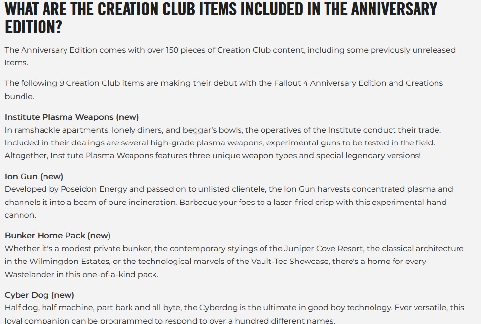 Anniversary Edition включает в себя базовую игру и шесть основных дополнений , включая Automatron , Far Harbor и Nuka-World , а также дополнения к Workshop: Wasteland Workshop , Contraptions Workshop и Vault-Tec Workshop . Кроме того, оно включает 150 элементов контента Creation Club , включая уже доступные, а также новый, ранее не выпущенный контент.