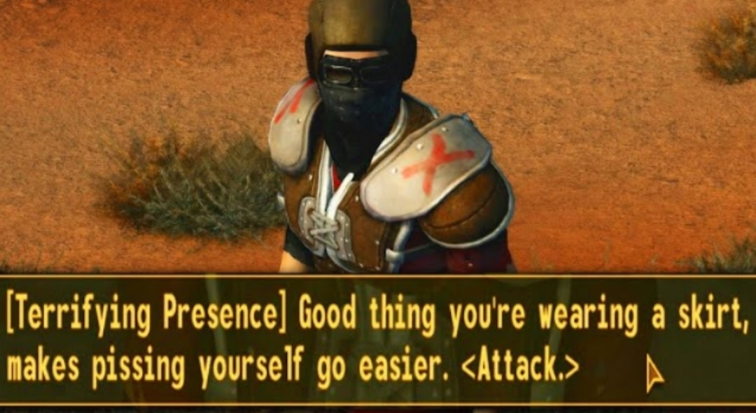 >Fallout: New Vegas ДЛЦ на третий фолач с меньшей картой. Все механики перекочевали из тройки, изменилась система кармы, изменился урон по врагам, чуточку изменилась система крафта и добавился режим выживания. Ещё изменилась система убеждения - в тройке у тебя был шанс уболтать, в НВ пороговые значения типа "можно/нельзя". Собсно, это и все отличия. Карма теперь не общая, а для каждой группировки своя. Вместо поглощения урона бронёй сделана анальная системе порога урона. Порог урона пропускает только тот урон, который превышает значение порога урона цели, а если урона меньше ПУ, пропускает единичку урона. Фактически, попытка смоделировать убогую систему из Готики, где враги на перманентном IDDQD, пока не повысишь уровень. Правда в Вегасе осталась лазейка из тройки - криты. Атака сукакрысы проходит мимо ПУ, поэтому можно со старта из вармин-винтовки перестрелять когтей на карьере, лишь бы прочности пухи хватило. Инсинератор из сника вообще сносит какие-то неприличные значения. Это не фича, это баг, но баг рабочий. Мир НВ по задумке разрабов - длинная кишка через Примм, Ниптон, Новак и дальше на Стрип к Хаусу. Чтобы ты не подумал, будто это опен врот и не стал что-то там отыгрывать, тебе все пути перекрыли невидимыми стенами и высокоуровневыми врагами. Правда вышеупомянутый баг позволяет вернуть разрабов на хуй и со старта бежать на кладбище убивать скорпионов критами. Ну и смехуёчков отсыпали безжалостно. Все эти ставшие мемом гули в космосе, бабушка-супермутант, весёлые пидарасы и так далее. Гемплейно НВ - всё та же тройка, чутка подмазанная косметикой и уменьшенная в четыре раза.