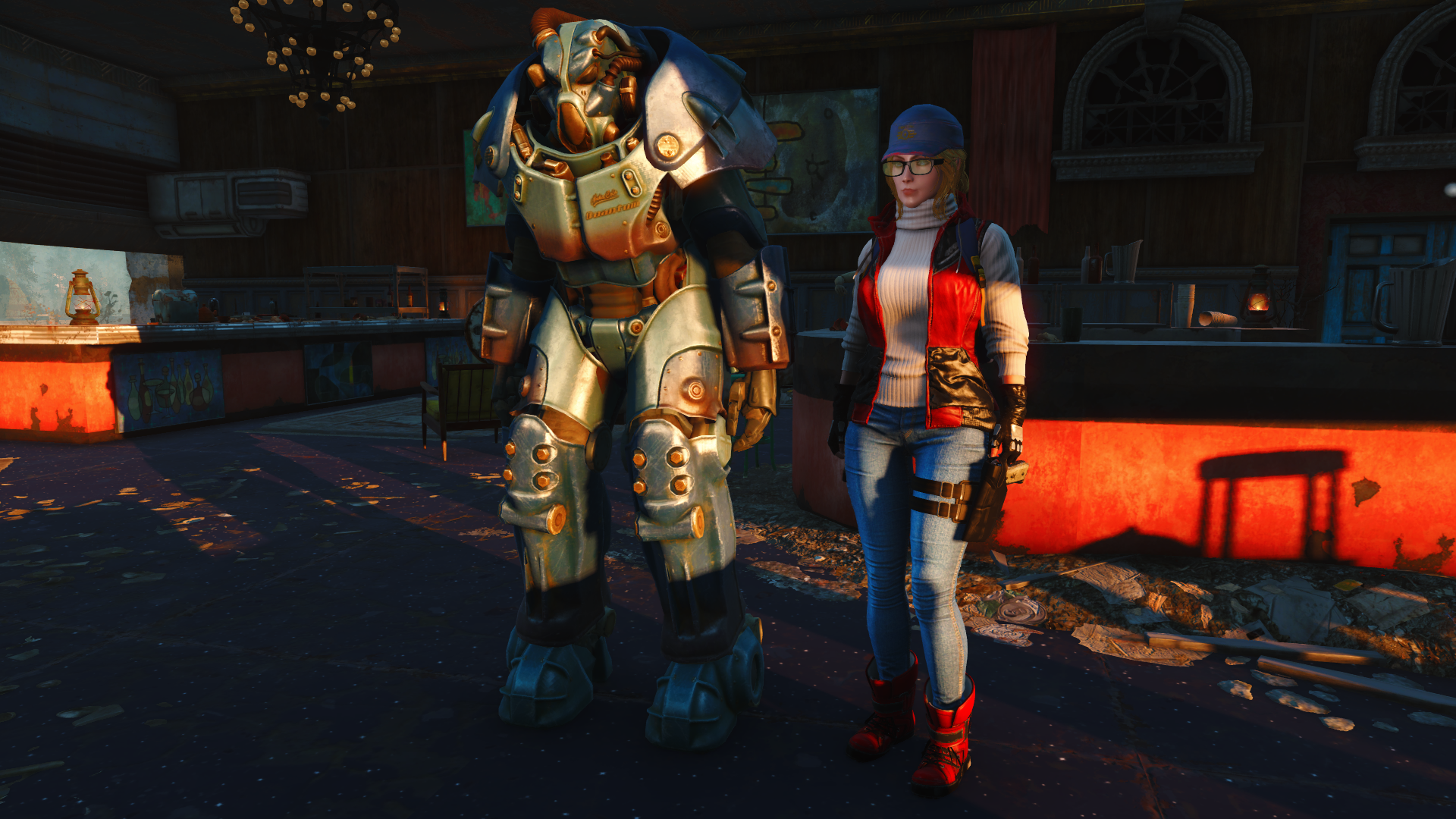 Брони достаточно (кожанная-рейдерская-металлическая-боевая. Броня синтов уробливый пластиковый кал кста) и её можно по-разному заточить. А ещё есть мод на степень забронированности. Это круто.