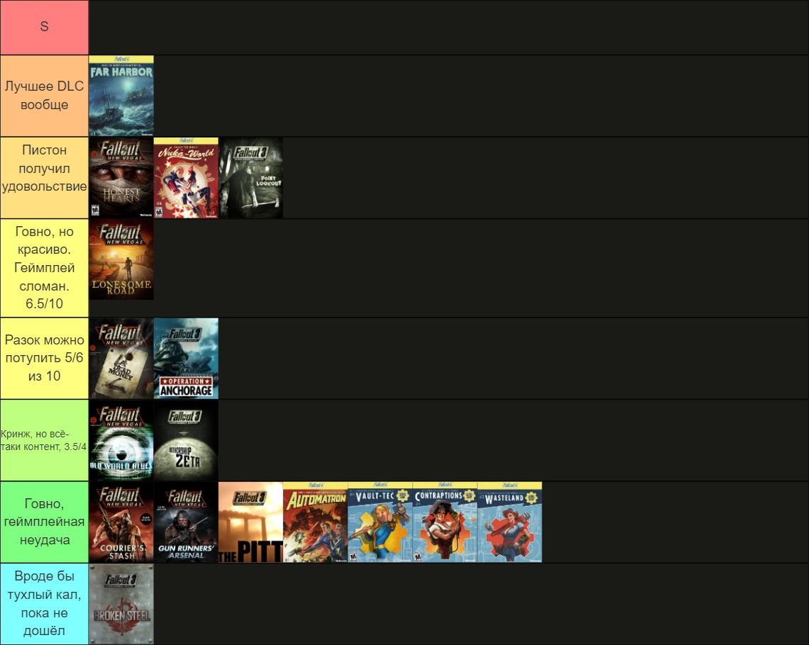 Фаллаут тиерлист. Да, я считаю четвёрку лучшим фаллаутом если из неё модами удалить говно или не трогать кринжовые аспекты игры. Она самая техничная и геймплейно приятная.