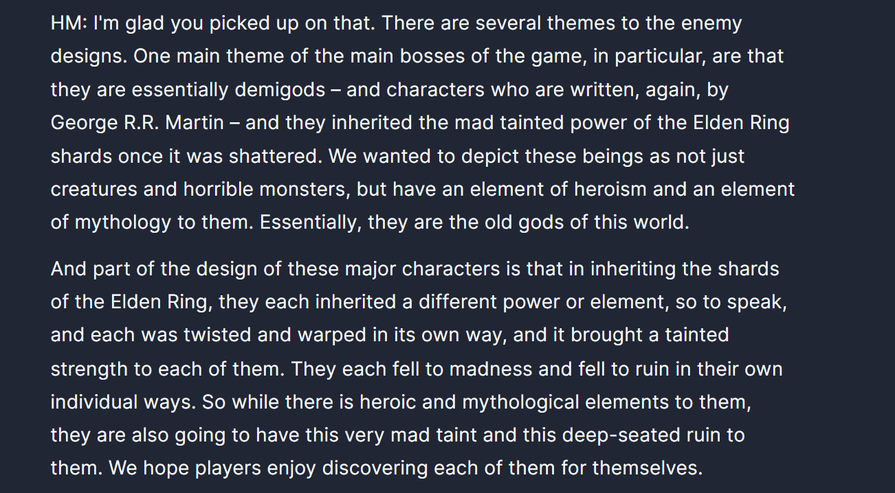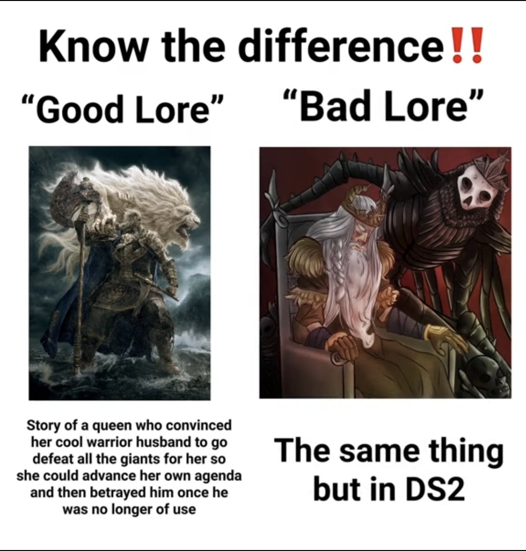 Забавная штука. Мне двуха с самого начала показалась какой-то не такой, было в ней что-то неправильное, инородное, не такое как раньше. До двухи я прошёл и однуху и демонов на плойке, а в двуху закатился уже на пк в 60 кадров. Моё ебало когда стартовый меч лопнул за ~10 ударов лучше не имаджинировать. Боссы показались мне хуйнёй уже тогда, что гигант, что преследователь, что четвёрка великих были просто кринжем и губками для урона. Кстати, я был уверен что если рубить гиганта по ногам, то он упадёт. Моё ебало когда гигант так и подох не упав можете не имагать. Хорошо что в бладике падения гигантов вернули, и в трёхе тоже. По лору тоже словил кучу непоняток и первые часы игры вообще не мог допереть что из этих обрывков разных историй есть центральная тема игры. А когда нащупал линию Веника и Нарашки, то был сразу сбит с толку боссом-жабой, Алдией, который до этого в лоре не появлялся, драконом и воспоминаниями гигантов. В общем закрыл я игру без малейшего понимания что произошло в Дранглике. Двуха в целом мне так и запомнилась, каким-то сырым огрызком с недописанной историей. А потом, спустя годы, я застал великую драму лорных войн и прочих приключений протыков. И оказалось в итоге, что мне тогда, в далёком 2014, нихуя не показалось. С игрой всё действительно очень не так.