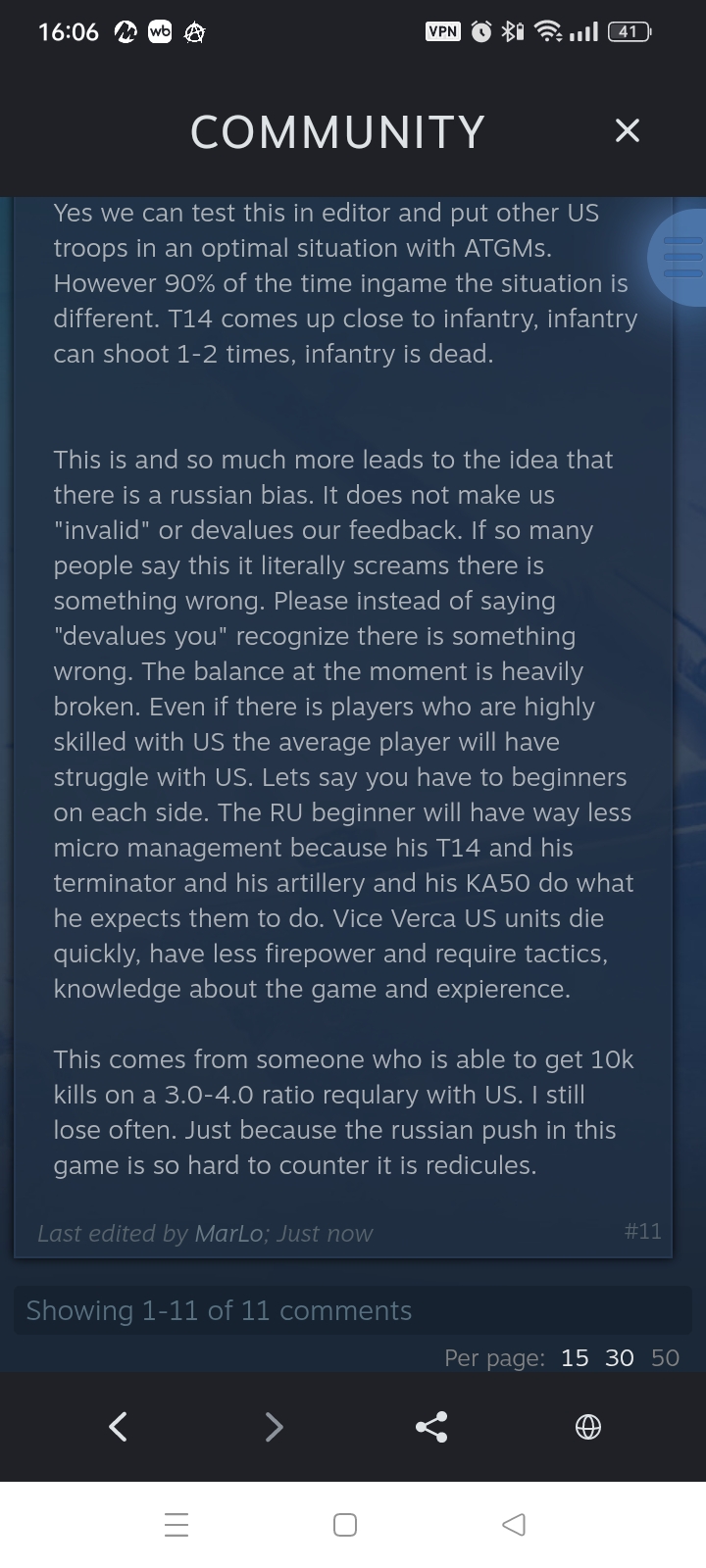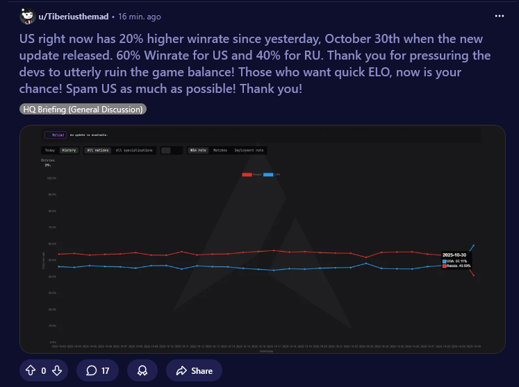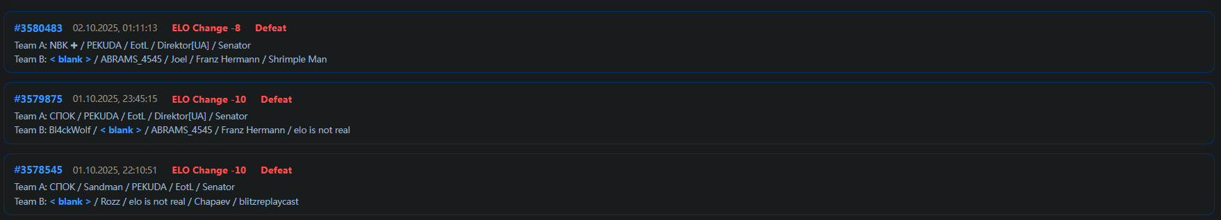 >>50421535 >Отсюда у меня вопрос, что подорвет щас жопы треда - может быть игроки РФ не на своих ЭЛО, из-за этого и такая разница в винрейте? Ладно разница не должна быть такой огромной но одна из причин явно то что средний игрок РФ на 200-300 пунктов выше чем должен быть Я хз, если в соло играть, то там все тупо от рандома зависит, тебя мотыляет по +500/-500 эло туда-сюда. У меня вот 10 каток подряд просто челы ливали/сдавались, когда победить еще могли, я сразу на -300 за день улетел. Потом 3 раза на 2к пиво наткнулся, которое абрамсами и шорадами давит и +150 сразу. Ты как не играй, за пятерых или даже за троих не выйдет, у тебя тупо лимита юнитов не хватит. Вот типа я сейчас 3-4 точки удерживал по центру, а хуй мне. Я типо должен не только как ебанутый все двигать и уворачиваться от бомбежки, но и на фланги сам летать успевать?