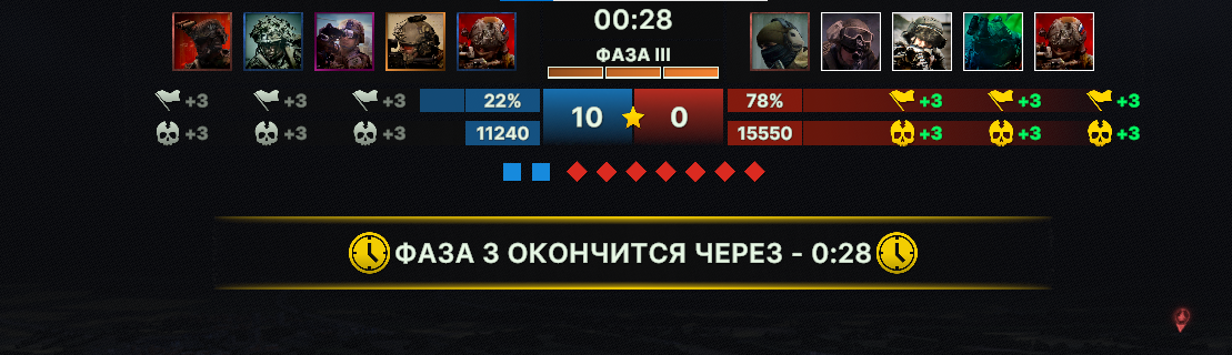 А знаете что самое интересное? Мы бы проебали этот бой, так как все 3 фазы РФ контролировали больше точек чем мы. Но вместо того чтобы сидеть на жопе ровно и вынуждать атаковать НАС, они продолжали накаты на нашу оборону и просто фидили на 2-3 ступень получение очков за фазу.