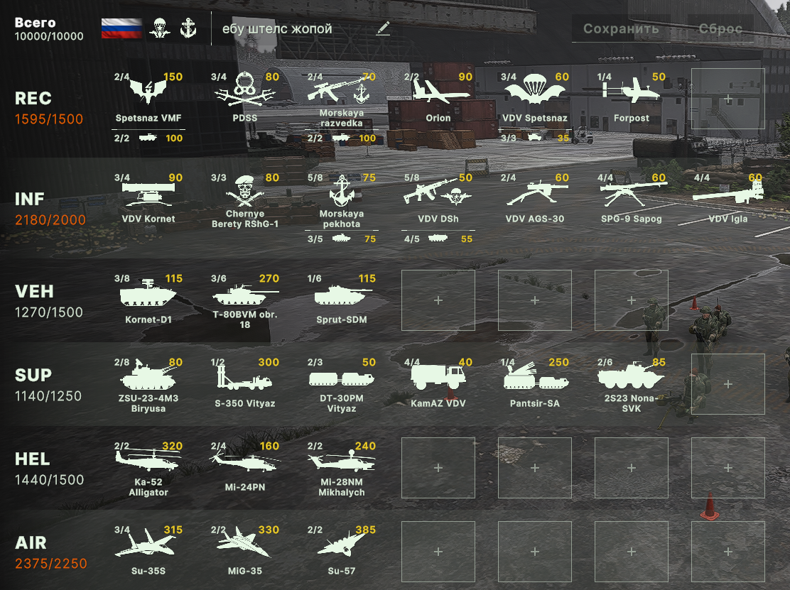 Кстати я уменьшил машинок на 3 и взял веапон сквад для открытых карт в количестве 1 шт для поддержки тоу 2а. >Хотел взять их как резерв есть аирборнов выебут всех разом Это надо постараться + у тебя на прикрытие смавы + АГЛы. А ф-15Е на чугуне это фундамент.