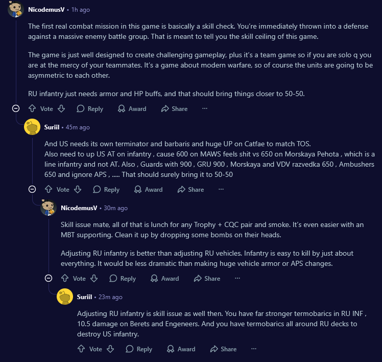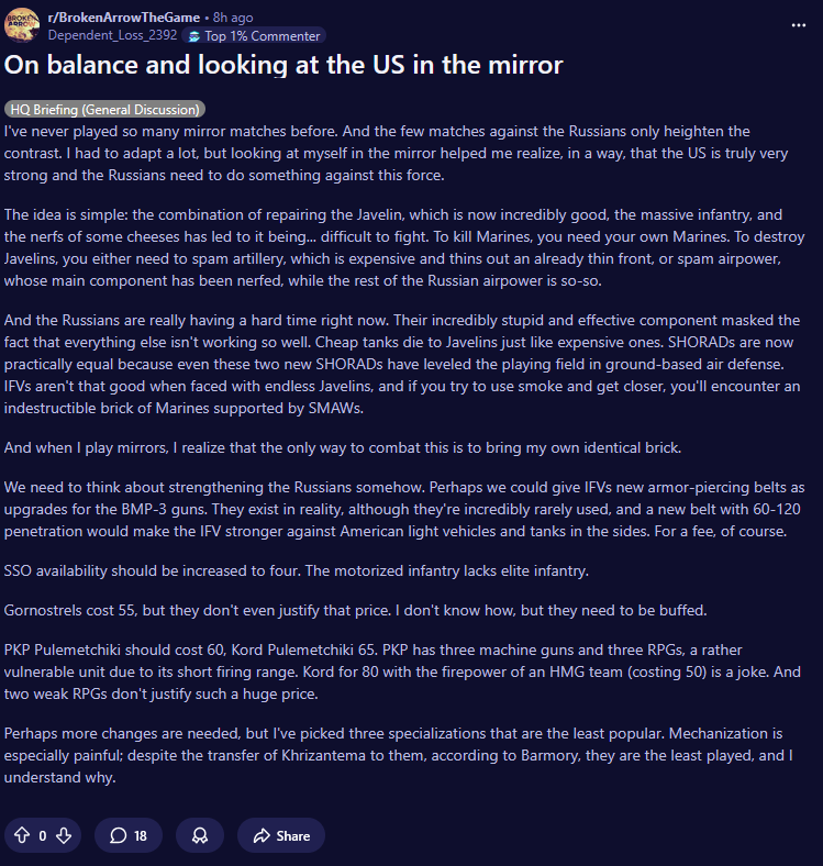 ТО есть блять, для меня абсурдна мысль делать спец антипех отряды когда пехота сосет буквально у всего и используется в суицид ранах аля БТФ3 с 2мя отрядами морпехов чтобы забрать танк...