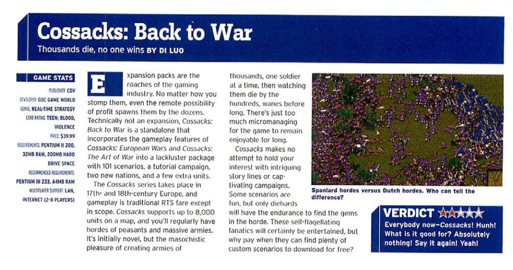 Решил поподробнее присмотреться к номерам CGW за 2001-2006 годы, во времена расцвета старопыс. Выяснилось несколько интересных деталей. Для начала - про сам журнал: 1. "А что, так можно было?" - в смысле, регулярно писать разгромные рецензии, ставить 2/5, и при этом успешно печататься на протяжении 25 лет? 2. Ассортимент. У нас старые журналы на 90% были заполнены описаниями очередных убийц CS, Warcraft и WoW, про которые уже через год никто не помнил. У американцев журналы на те же 90% состояли из статей про таких же убийц, но консольных эксклюзивов. А вот в CGW писали о тех играх, про которые до сих пор помнят олдфаги - Gothic, NOLF, Syberia, F.E.A.R. и много других страшных слов. 3. И уже конкретно про Пыс. Вот уж кто-кто, а CGW сделали всё, чтобы Грига понял - его там (в Америке в целом, и в журнале в частности) - никто с цветами встречать не собирается. Ну просто поглядите на оценки. Впечатление такое, будто в редакции был бывший сотрудник Близзард, который узнал про Warcraft 2000 и решил отплатить Григоровичу по полной. Причем оценки 2-2.5 досталось именно тем проектам, которые делались с прицелом на западный рынок - "Завоеванию Америки", "Александру", "Героям". Знал ли про это Грига? По-видимому, знал. Я не обратил особого внимания, но в рецензии на ТЧ текст на первом развороте был посвящен тому, почему редакция тогда еще CGW, а ныне "Games for Windows", отказалась от практики "эксклюзивных обзоров", и критериям оценки (Сталкер, кстати, по новым меркам получил 8/10 - "хорошо", но не "отлично"). Казалось бы, зачем понадобилось такое эксклюзивное предупреждение?